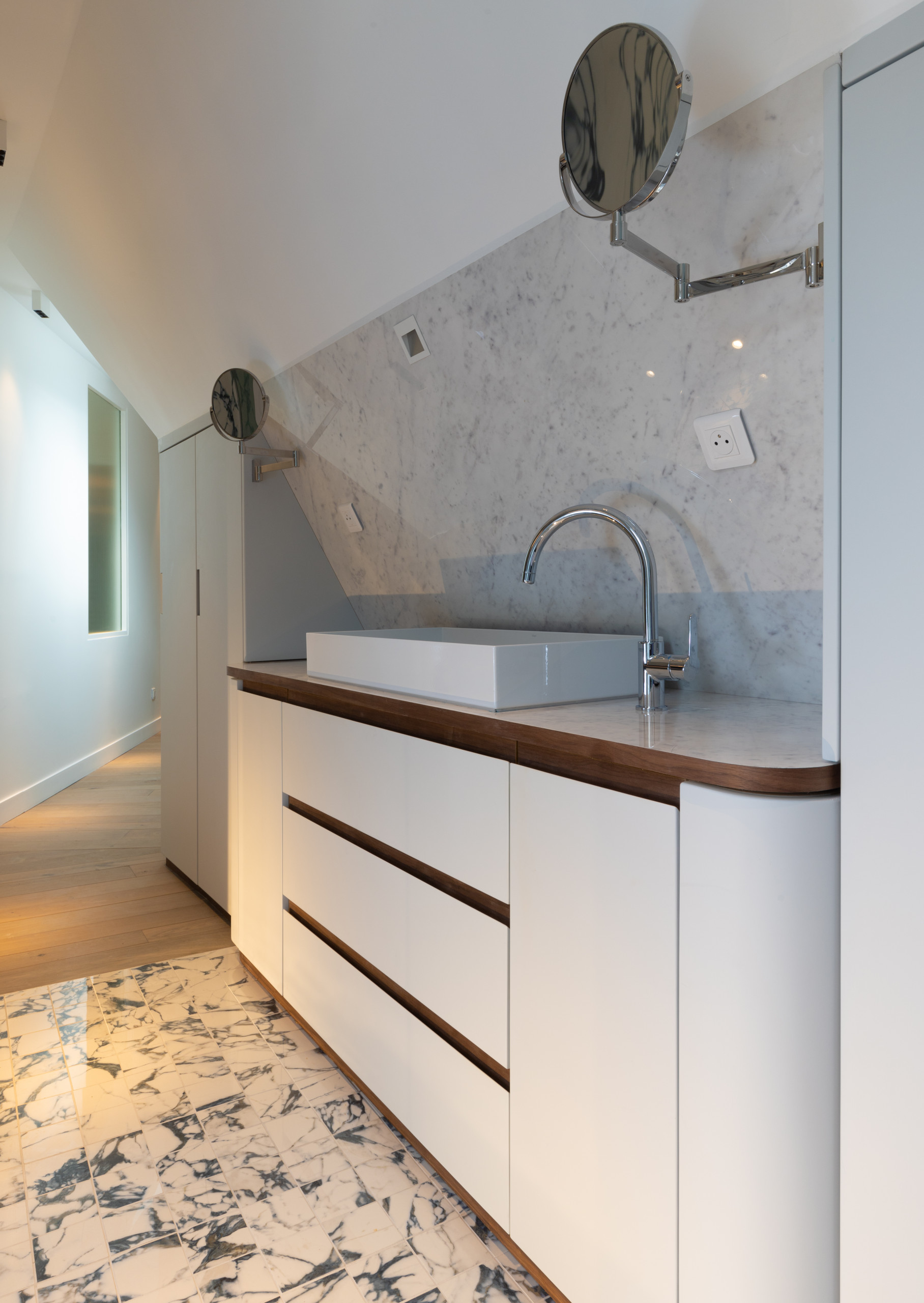 Dans le même logement aménagé par l’Atelier FB, une autre soupente a été utilisée pour gagner de la place dans une salle de bains. Ici, la bonne idée a été de placer la robinetterie sur le côté pour faire rentrer le meuble vasque sous la pente du toit. Et pour ne perdre aucune miette de la place disponible, deux placards sur mesure ont été aménagés de part et d’autre du plan vasque.