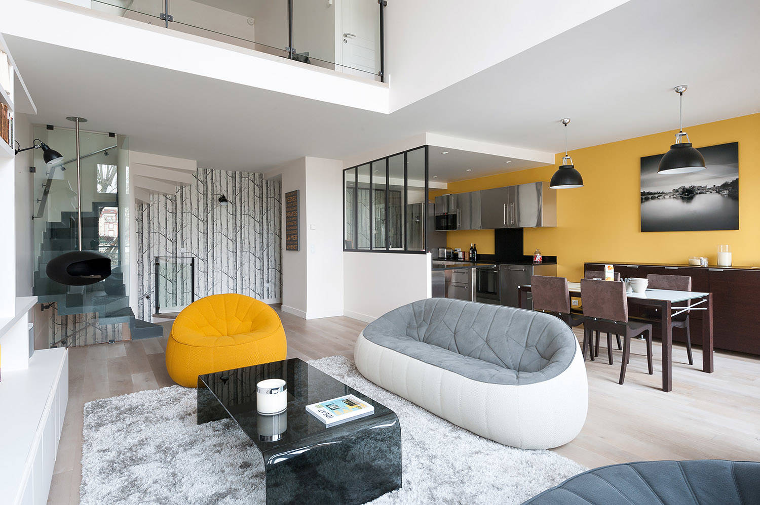 Alexandra Magne a opté pour le mariage du jaune et du gris car les propriétaires souhaitaient un foyer à la fois moderne et pétillant. Les deux couleurs se retrouvent dans la cuisine-salle à manger pour un ensemble harmonieux. Devant un pan de mur peint à l’aide du jaune Babouche de Farrow & Ball, la cuisine se dresse, tout en Inox et en granit noir. Parce que le couple avait envie d’un intérieur dans l’air du temps, la décoratrice a fait appel à un serrurier pour réaliser la verrière de la cuisine. L’artisan a également créé les garde-corps de l’escalier. Une petite touche industrielle rehaussée par les appliques Gras qui encadrent le meuble TV et les suspensions de la salle à manger. Les propriétaires sont ravis de cet intérieur à la fois design et convivial qui leur ressemble !