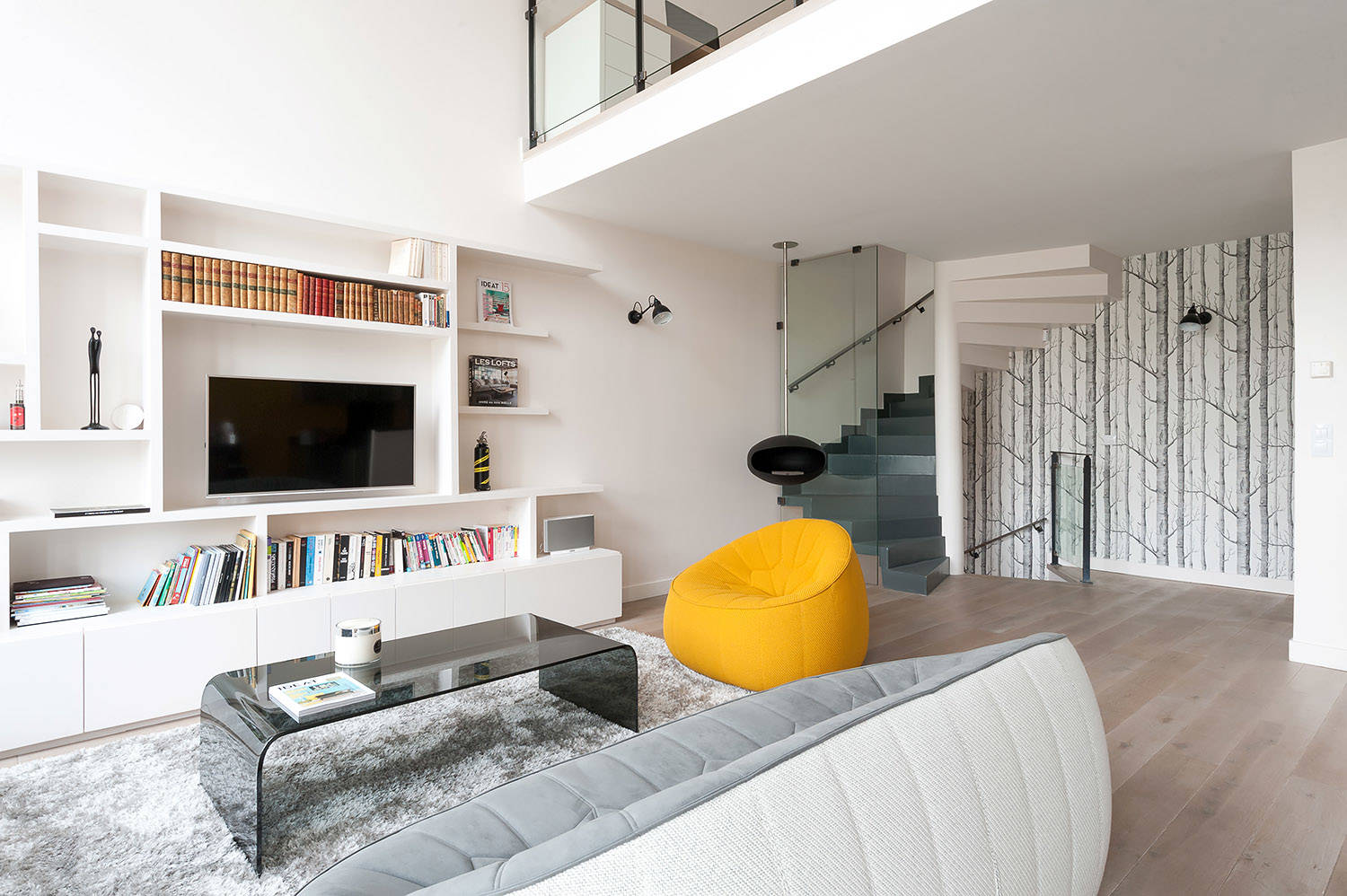Seule note de couleur vive du salon : le jaune qui rayonne grâce au fauteuil Ottoman de Cinna, imaginé par le designer et architecte d’intérieur français Noé Duchaufour-Lawrance. Il est associé à plusieurs teintes de gris qui apportent du relief au mobilier. Le tapis, un peu plus clair, contraste avec l’escalier, plus foncé. Initialement revêtu de parquet, ce dernier a été dénudé avant d’être recouvert d’une peinture antidérapante pour un effet béton ciré à l’esprit très contemporain dont le couple est fan. D’ailleurs, ils ont souhaité ajouter une touche d’originalité à leur déco en installant cette cheminée suspendue à l’éthanol, parfaite pour les soirées d’hiver lorsque la neige tombe derrière les baies vitrées ! Sur le palier, le papier peint Woods, de Cole and Son, souhaite la bienvenue aux invités. Il introduit le coin de nature situé juste en face, et se prolonge avec une terrasse extérieure qui donne directement sur la Seine et permet ainsi à la famille de profiter des beaux jours.