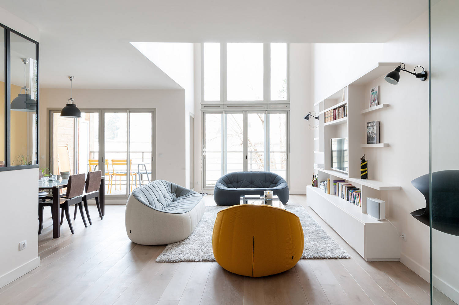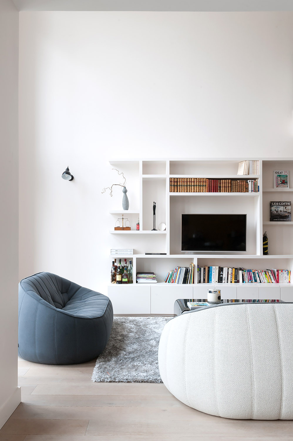 Pour mettre en valeur les volumes, et faire en sorte que la lumière naturelle inonde cette pièce de vie principale, Alexandra Magne a privilégié le blanc sur les murs et un parquet en chêne blanchi au sol. Elle a également préféré fondre dans le décor le meuble TV-bibliothèque qu’elle a dessiné et fait réaliser en MDF peint.