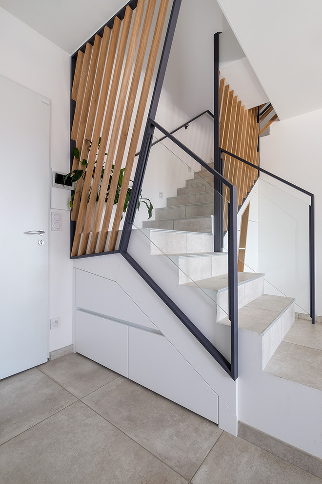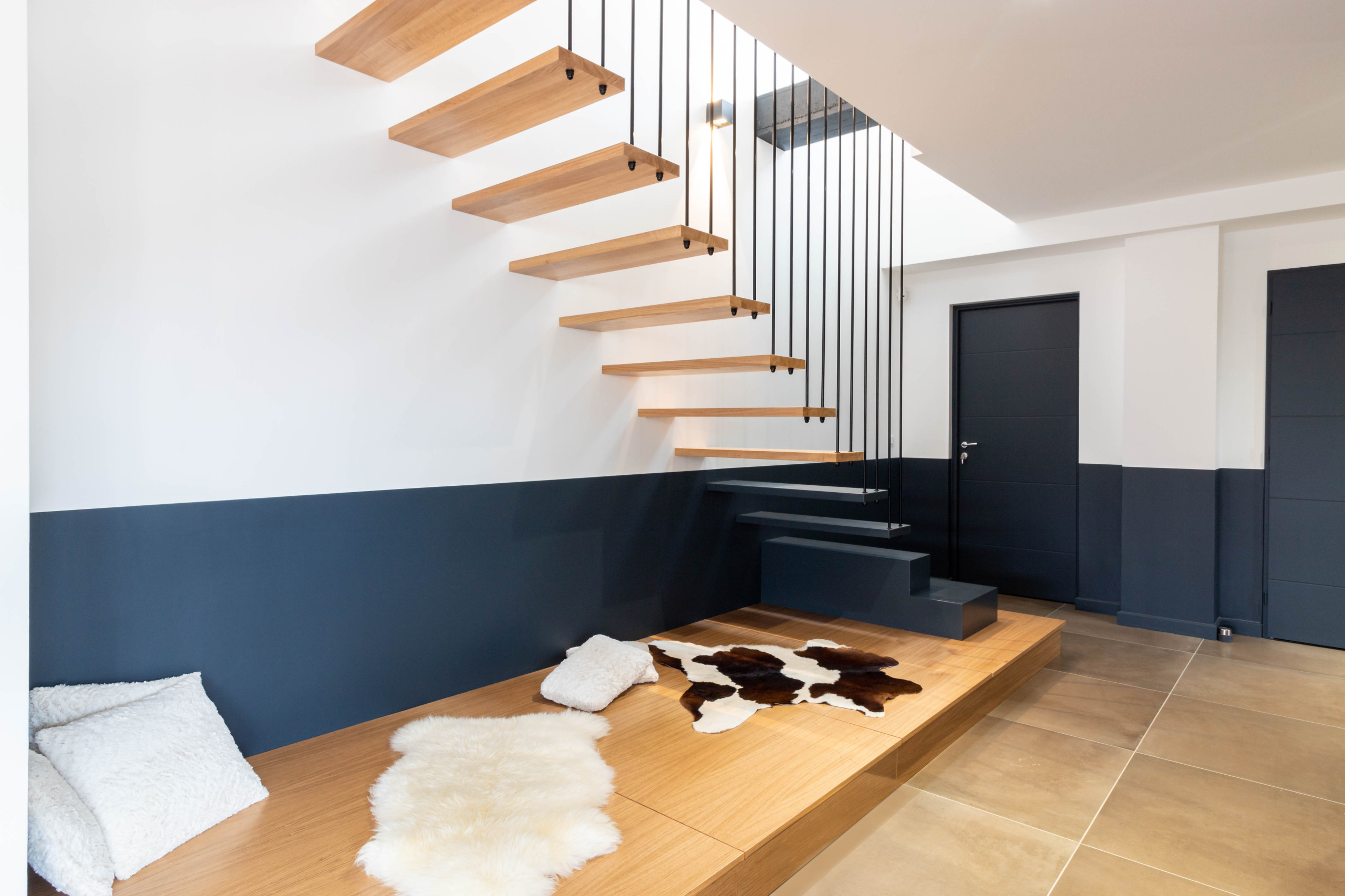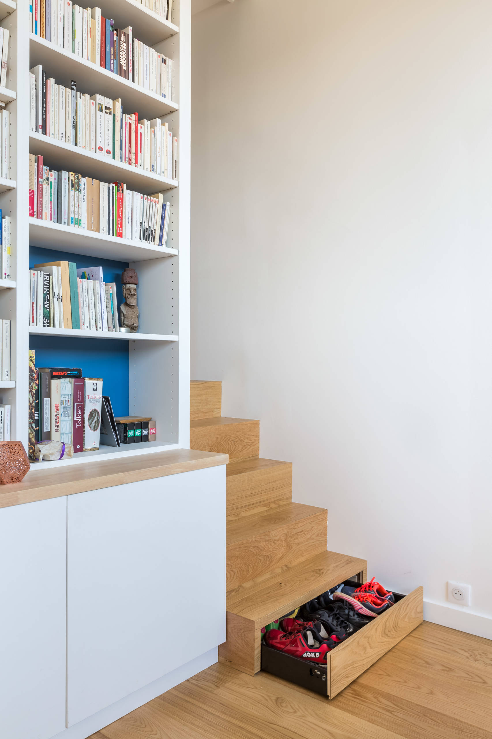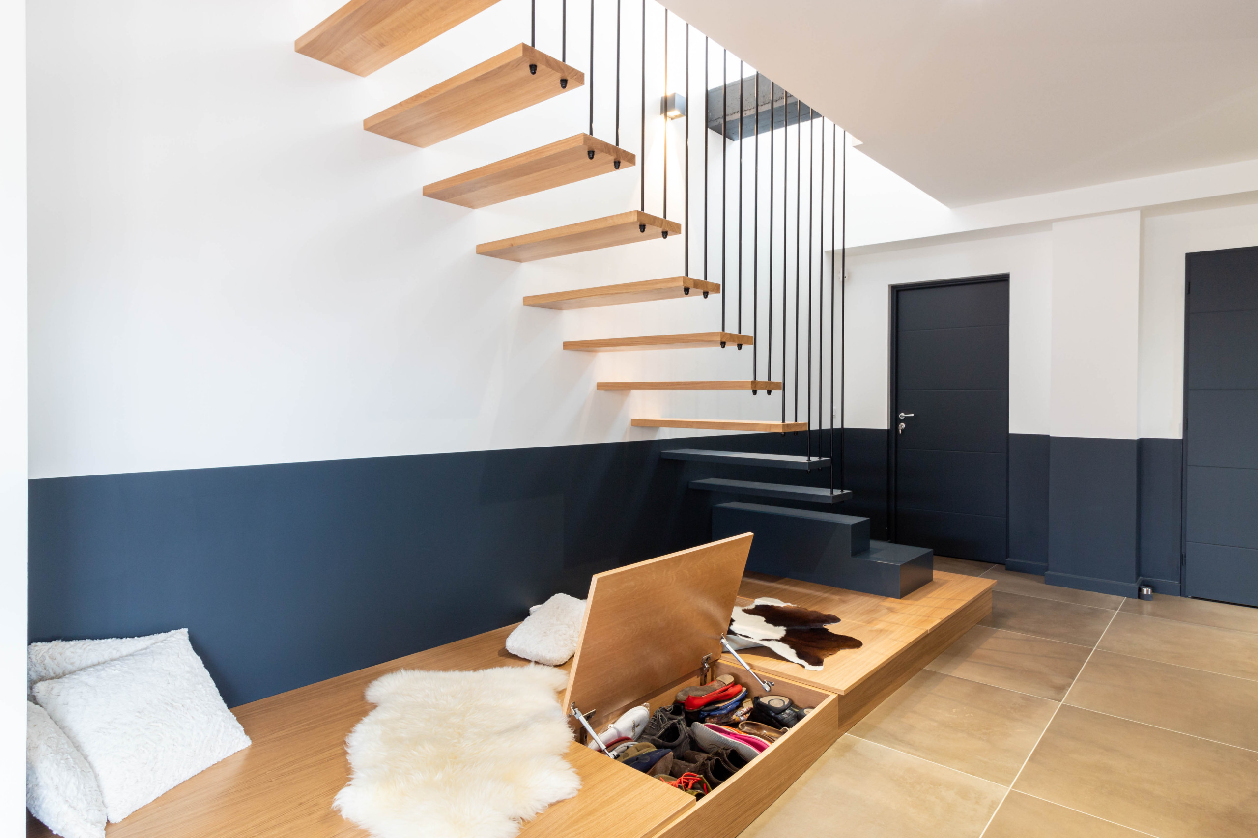 En plus d’être esthétique et d’apporter du caractère à l’entrée, cet escalier est truffé de rangements. Son concepteur, le menuisier Guillaume Bouvet, a notamment intégré deux coffres sur roulettes et un tiroir laqué blanc sous la première volée de marches.