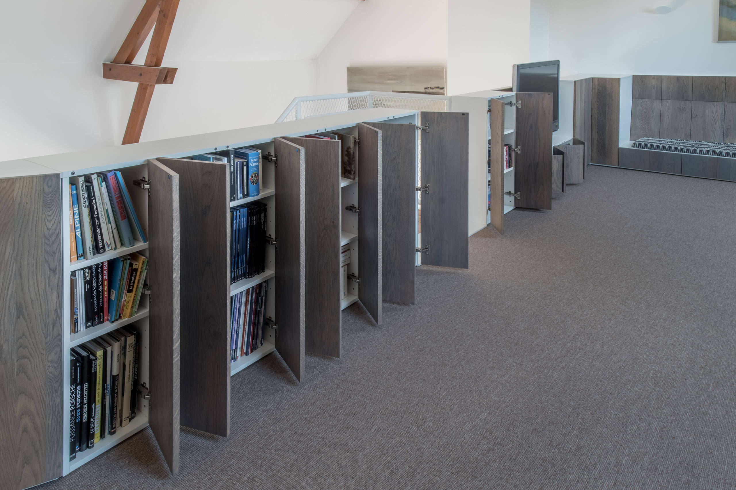 Sur la mezzanine de ce même salon, l’architecte a été jusqu’à optimiser le garde-corps pour créer des rangements supplémentaires. Presqu’invisibles quand les portes sont fermées, notamment grâce à l’absence de poignée, ils cachent en réalité toute une collection de livres.