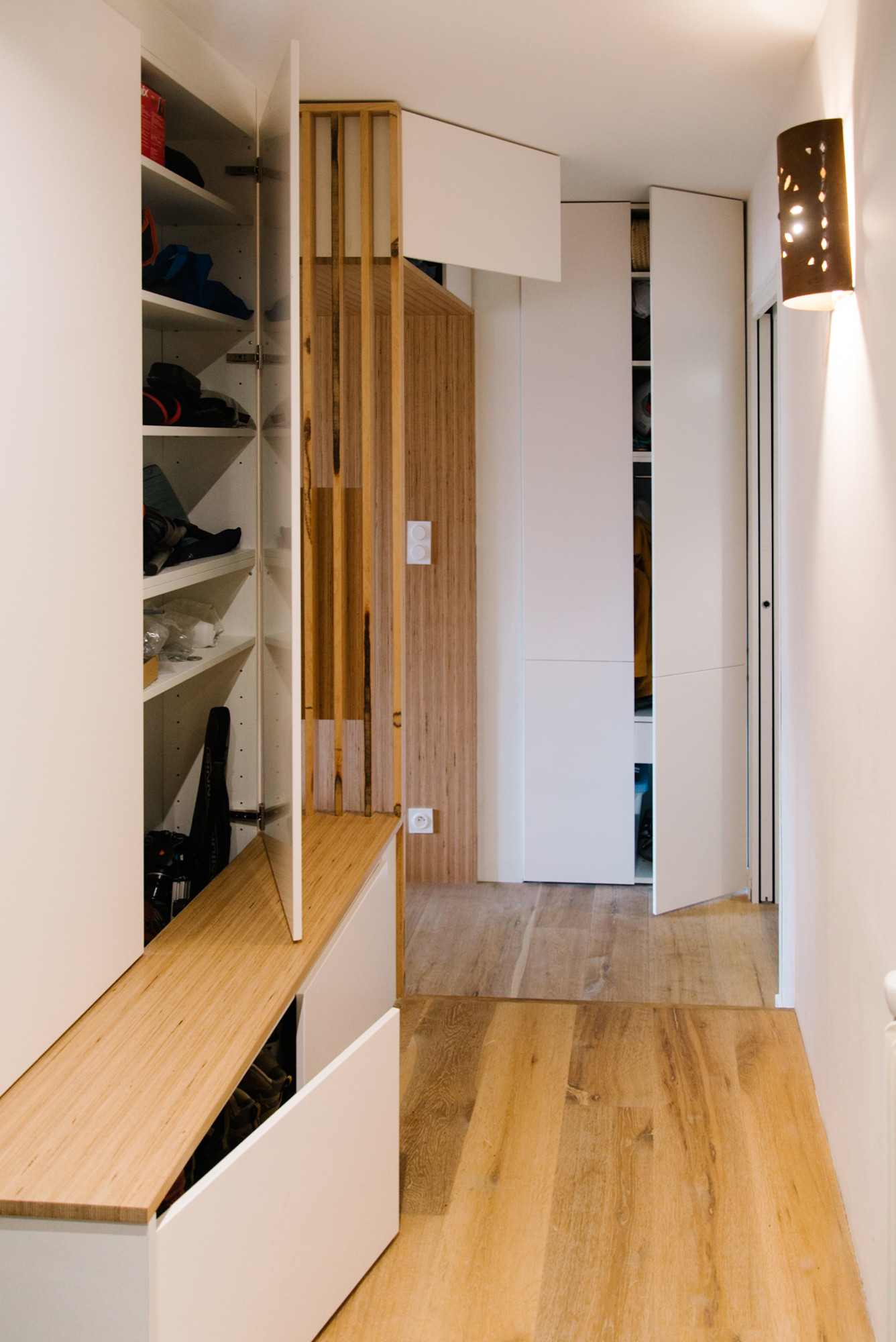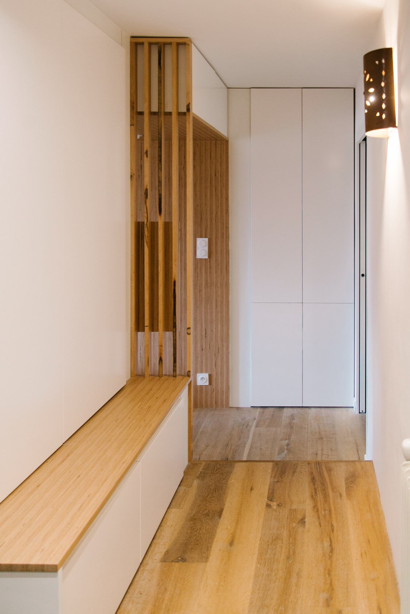 Le grand placard du fond est complété par un aménagement sur mesure, comprenant un banc avec rangements intégrés ainsi qu’un autre placard en partie haute. Le tout partiellement dissimulé derrière un claustra en bois.