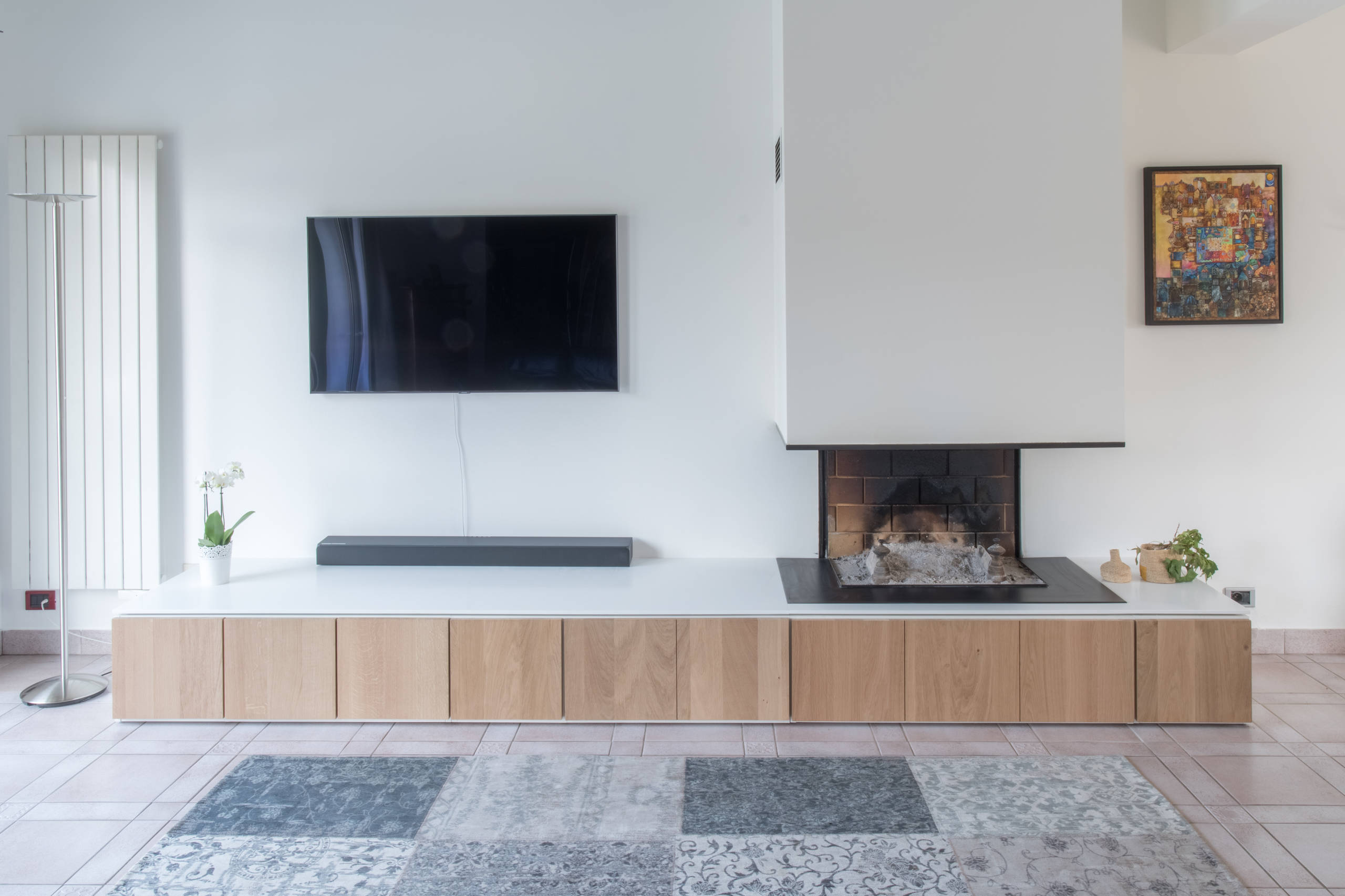 À première vue, cet aménagement ressemble à un meuble bas standard. Derrière la sobriété de ses portes, le meuble conçu par l’architecte Maxime Hurdequint cache en réalité des rangements taillés sur mesure pour ce salon. Espace de stockage pour le bois, compartiments pour les ustensiles de la cheminée, prises électriques pour la télévision, bar et tiroirs de rangement pour les livres et DVD, rien n’a été oublié.