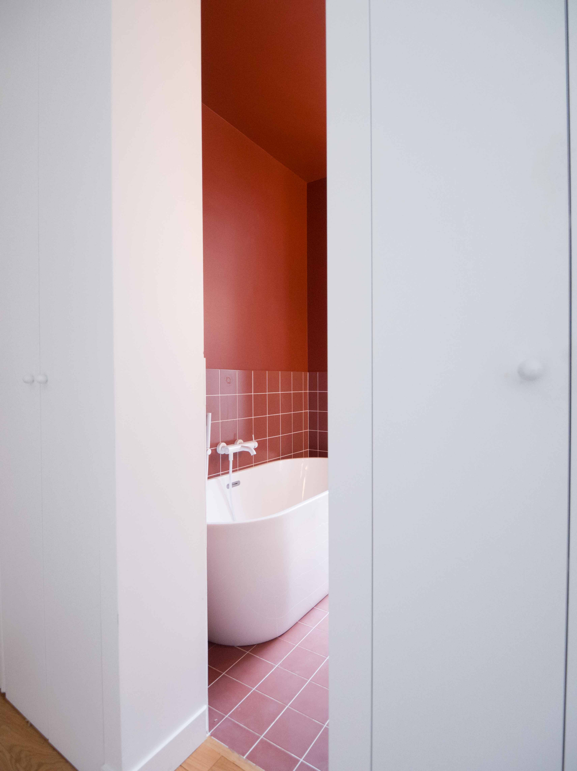 Difficile de soupçonner la présence de cette salle de bains haute en couleur lorsque la porte est fermée. S’inscrivant dans un projet mené par l’agence d’architecture anthropie architecture(s), la pièce est parfaitement cachée avec un accès fondu dans le dressing, qui fait alors office de cloison entre les deux espaces. En ouvrant la porte, l’effet de surprise est décuplé par la décoration pep de la salle de bains, avec ses carreaux de faïence terracotta en finition mate.
