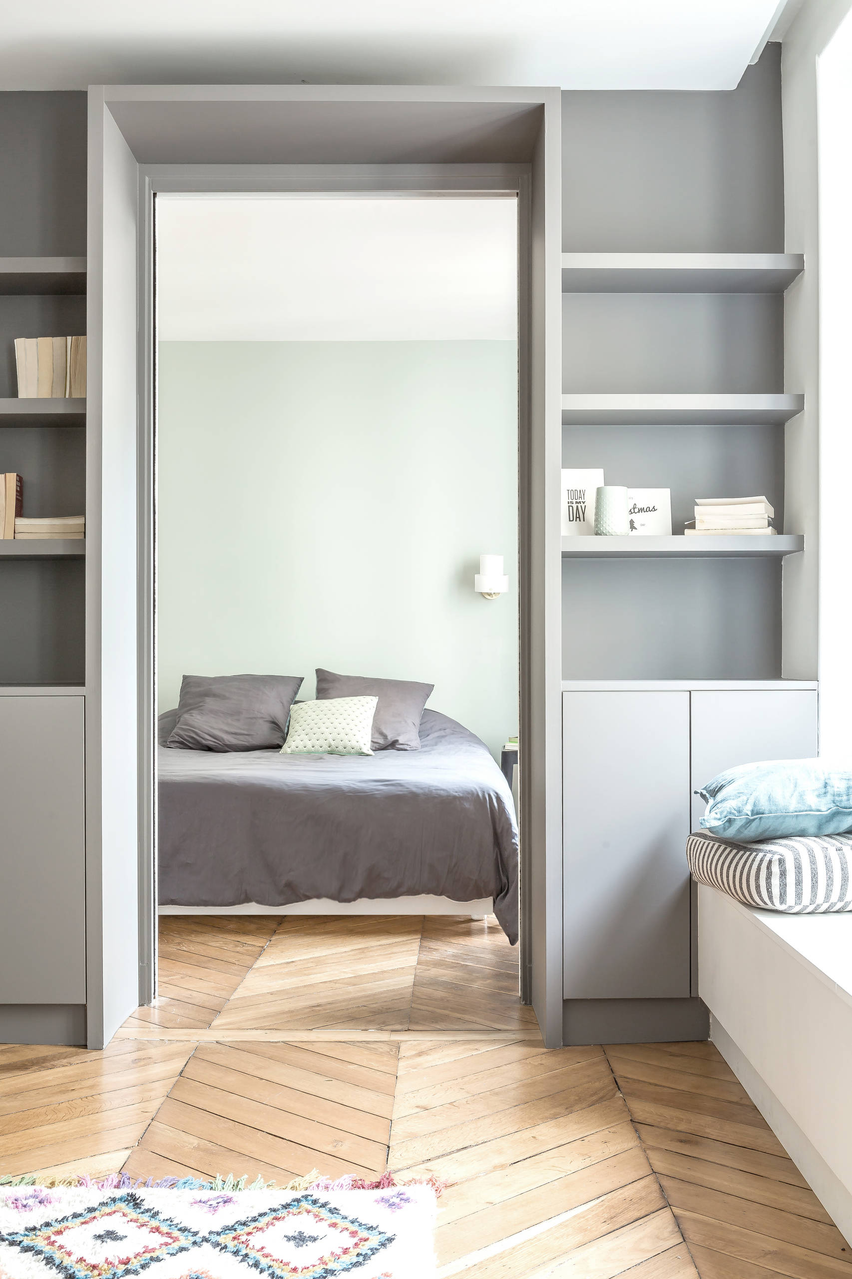La chambre principale de cet appartement repensé par l’atelier daaa manquait cruellement d’intimité. Elle était en effet séparée du salon par un système de moucharabiehs coulissants. Ceux-ci ont donc été remplacés par un pan de mur doté d’une double porte à galandage, sur lequel sont venus s’adosser de précieux rangements fermés et ouverts. La couleur grise apporte du contraste et souligne le large passage conçu pour rester ouvert la plupart du temps.