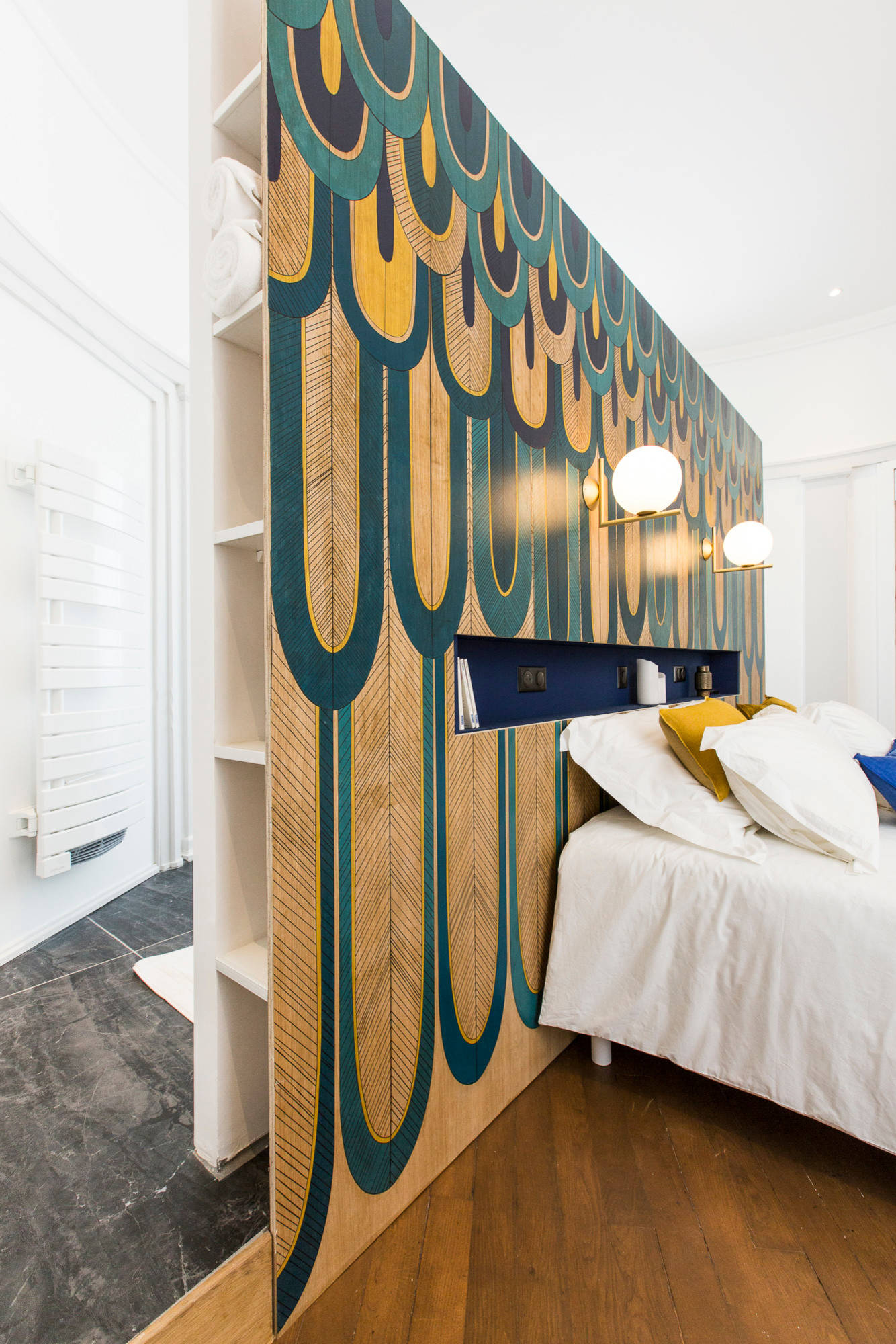 Dans ce projet mené par l’architecte Alia Bengana, il était question de créer une salle de bains attenante à la chambre sans dénaturer les atouts haussmanniens de l’appartement. Pour régler les problèmes liés à l’ouverture de celle-ci, la professionnelle a eu l’idée d’un dressing qui ne monte pas jusqu’au plafond, servant ainsi de cloison tout en préservant la beauté des moulures qui donnent tout son charme à la pièce.