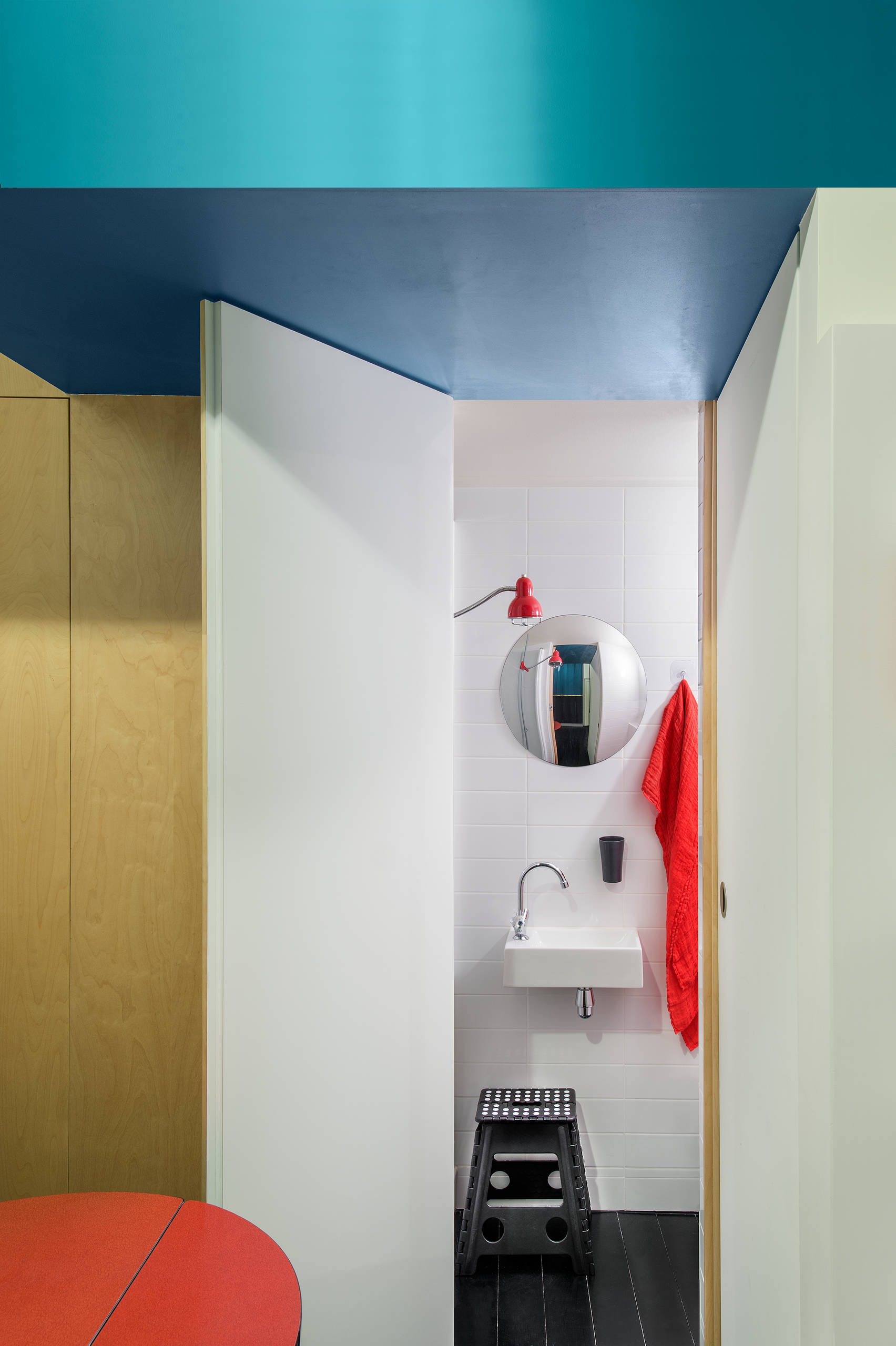Dans ce studio de 10 m² repensé par l’architecte d’intérieur Estelle Griffe, les portes jouent un rôle clé, s’ouvrant sur un placard, sur une cuisine dépliable ou une salle de bains. Parmi les solutions les plus malignes trouvées par la professionnelle se trouve cette ouverture conjointe entre salle de bains et penderie. Elle permet de créer un dressing temporaire et double la superficie de l’espace bien-être au besoin.