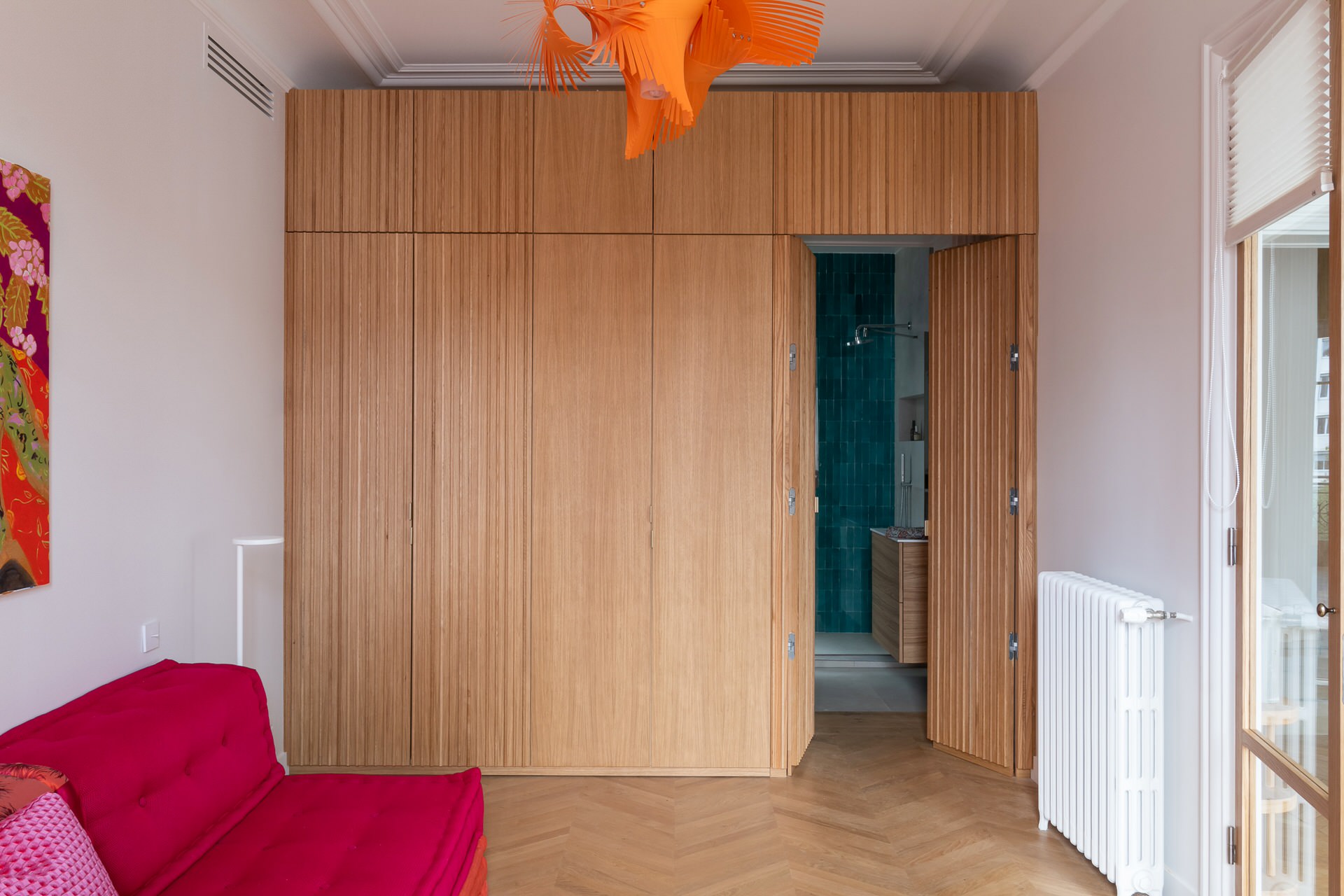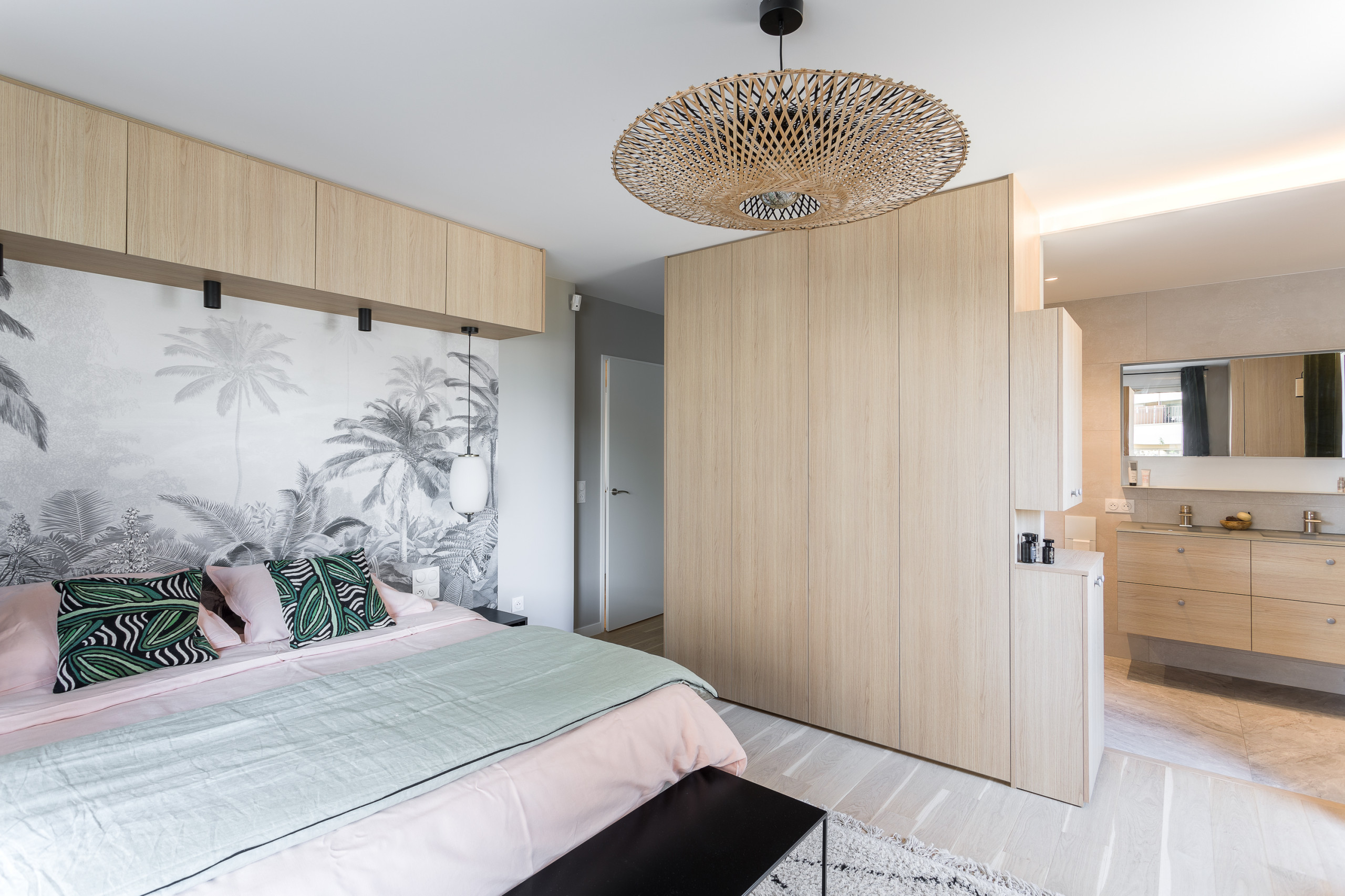 Pour ce projet, l’objectif de l’architecte d’intérieur Isabelle Hamard, de l’agence IH Studio, était de personnaliser un appartement acheté sur plan. Dans la chambre parentale, elle a fait réaliser des placards en placage chêne sur le mur qui donne accès à la salle de bains. Quatre colonnes de dressing y ont donc été installées, effaçant la frontière entre les deux espaces et optimisant les rangements dans la pièce. Elles viennent en complément des placards aménagés au-dessus du lit.