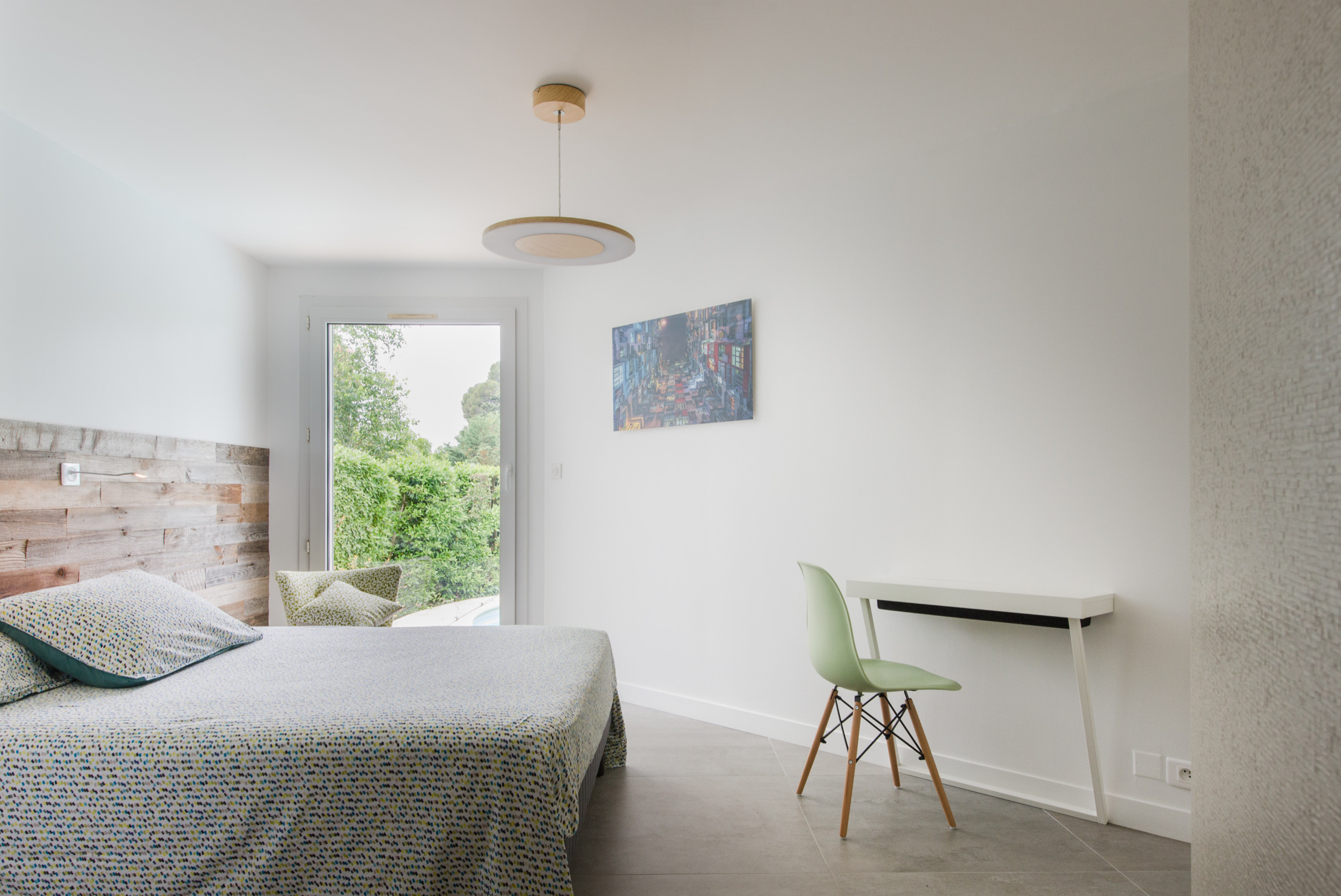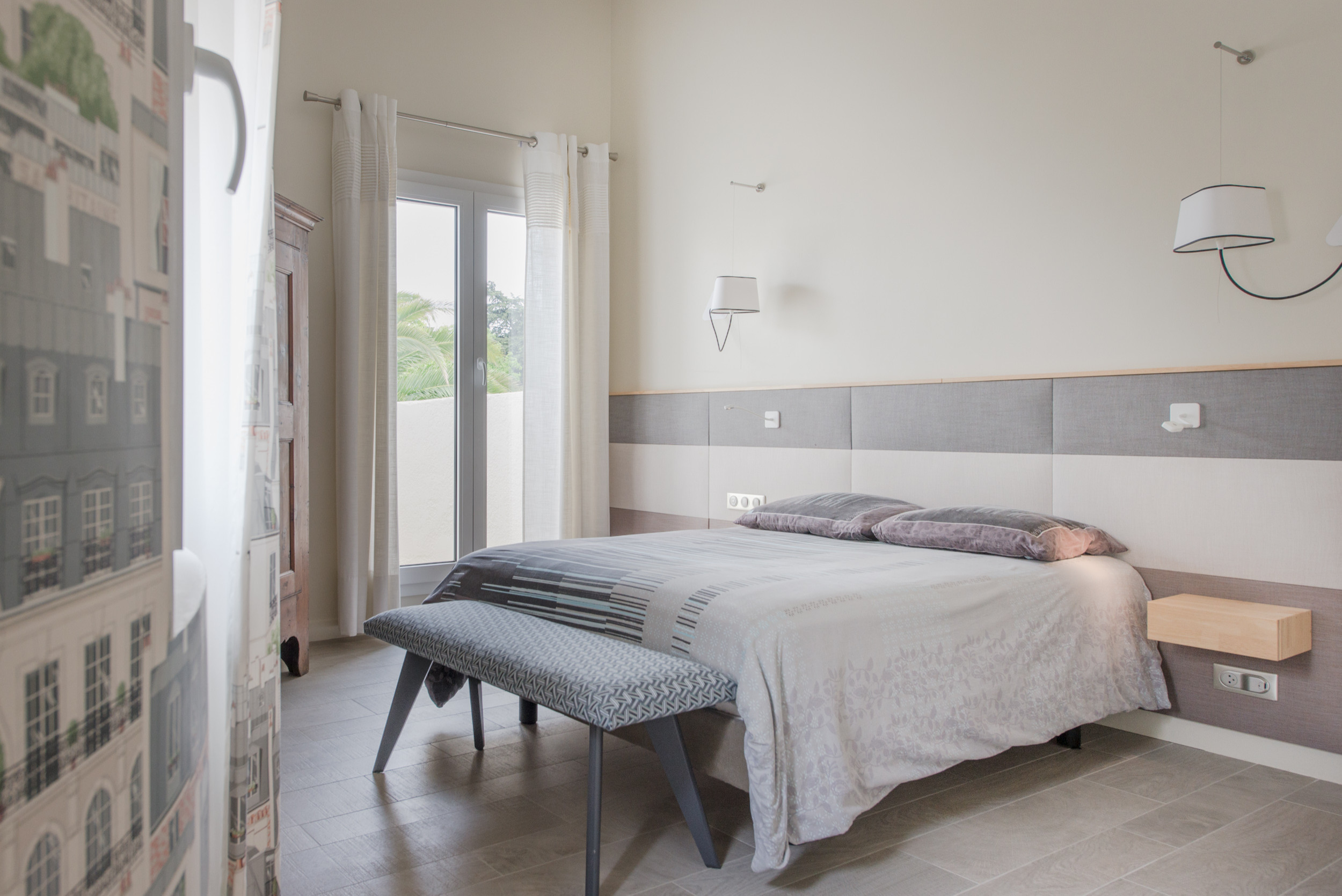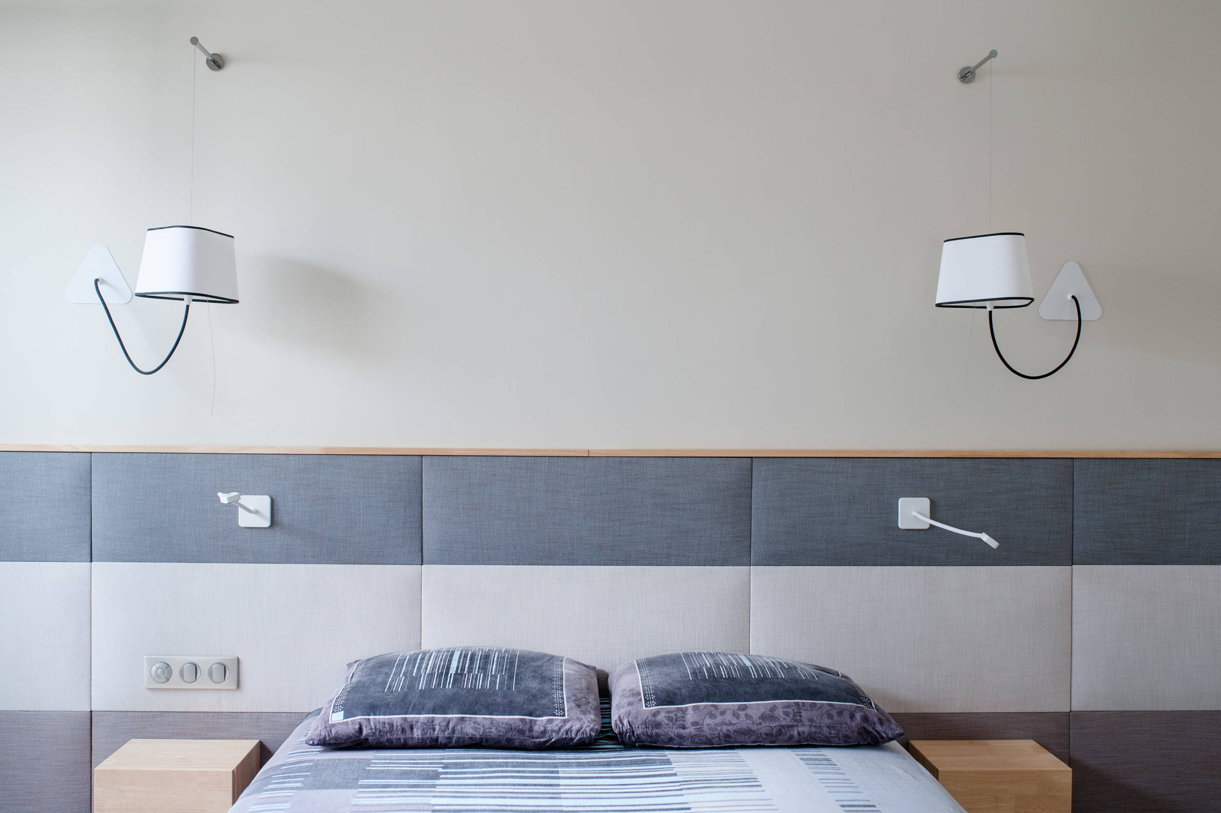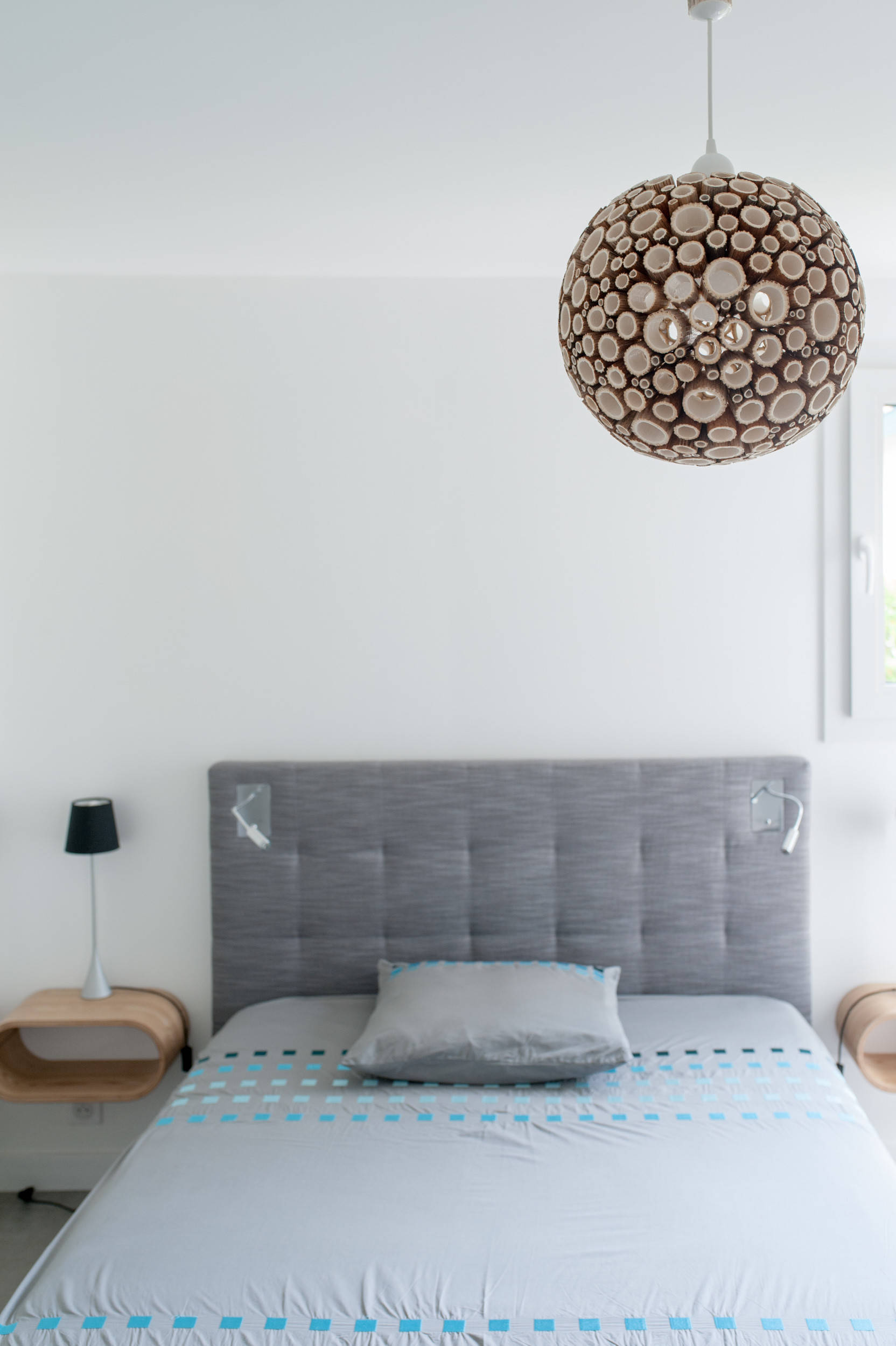 La tête de lit a été fabriquée par un artisan local. Elle remplace des anciennes niches et uniformise le mur par son côté tout en longueur. Des chevets suspendus y ont été intégrés.