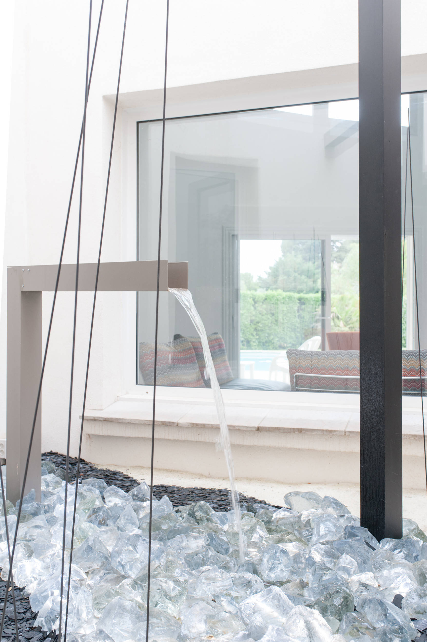 La professionnelle et les propriétaires ont fait appel à un paysagiste pour valoriser le patio, grâce à une mise en scène sobre et contemporaine. Composée de galets lumineux et de bandeaux transparents, la fontaine constitue la pièce centrale de la composition, rehaussée de tiges en fibre de verre qui bougent avec le vent. Un érable a aussi été planté afin d’apporter de la verdure.