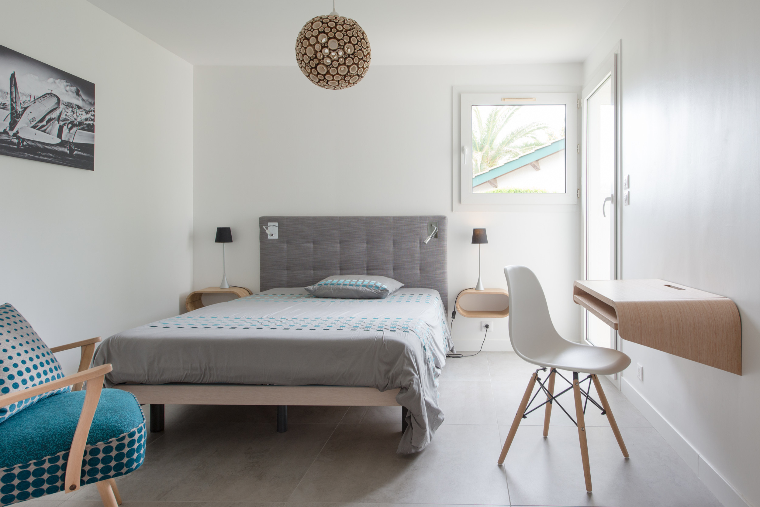 Dans la chambre de leur fils aîné, devenu à son tour pilote d’avion, la décoration sobre et contemporaine fait aussi mention de la passion familiale pour l’aérien. Une entreprise locale a réalisé la tête de lit et un tapissier a donné une nouvelle vie au fauteuil en le parant d’un bleu dynamique.