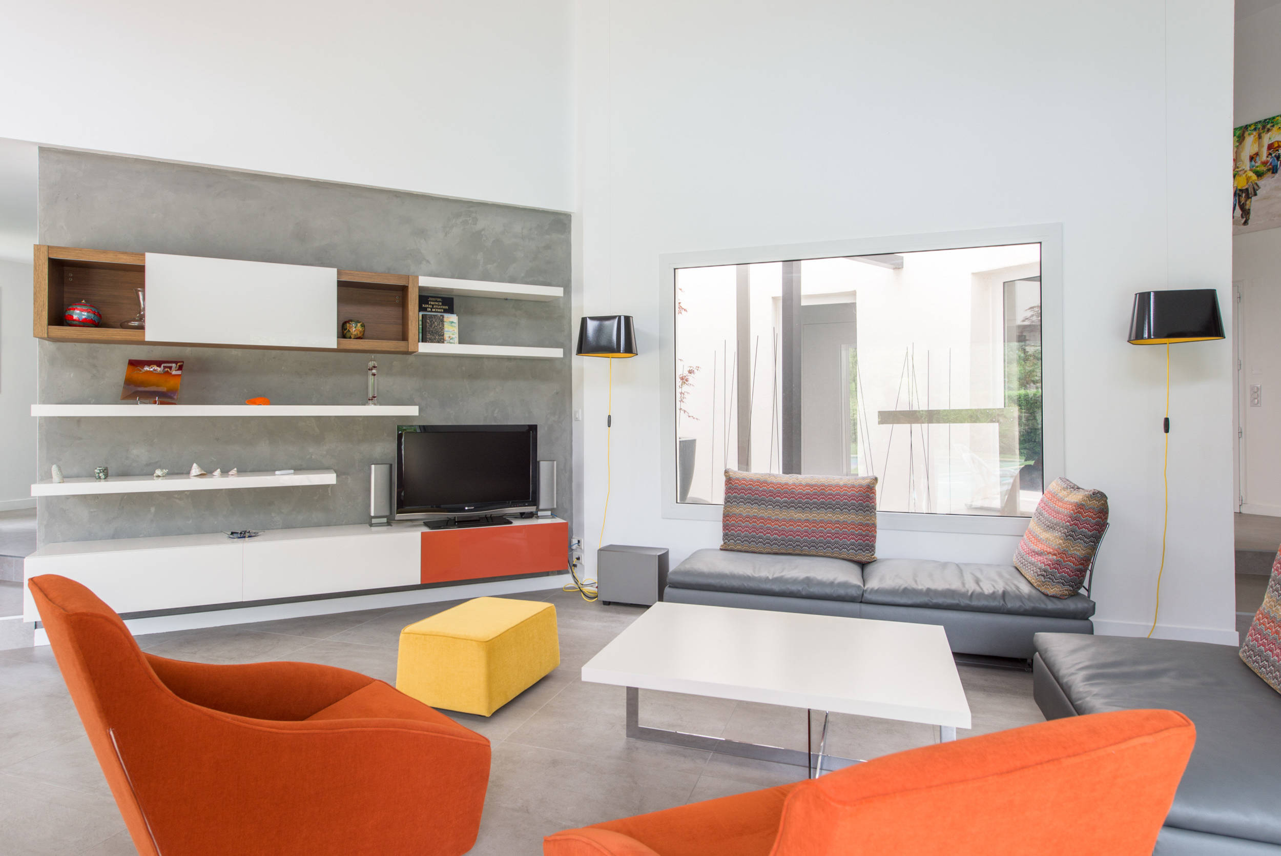Côté aménagement, les meubles mélangent le blanc, le bois et la couleur rouille pour créer une ambiance dominante. Les poufs et fauteuils dont disposaient déjà les propriétaires ont été retapissés pour se marier avec la nouvelle décoration.