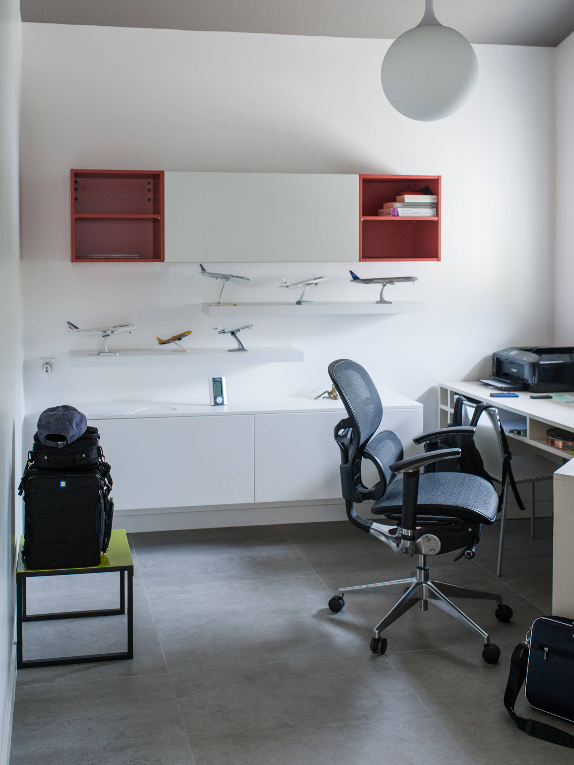 Pour compenser la faible hauteur sous plafond du bureau, ce dernier a été peint en gris afin de créer un effet d’optique intéressant et de repositionner les volumes. Aux murs, de grands caissons, en réalité des modules adaptables très pratiques issus de la grande distribution, apportent du rangement supplémentaire. La série d’avions décoratifs est un clin d’œil à la profession du propriétaire, pilote d’avion.