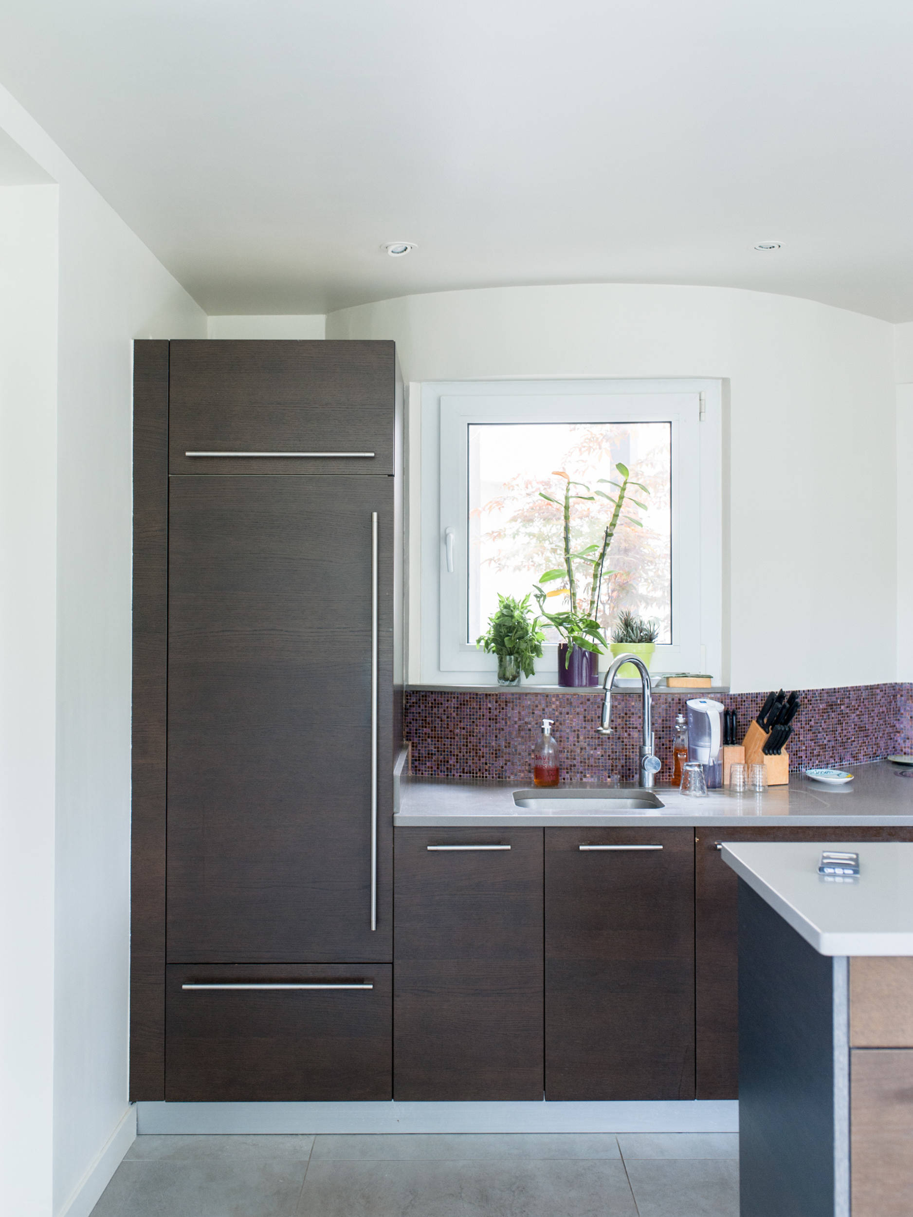 Lors de la rénovation, des placards ont été intégrés dans les murs pour augmenter la capacité de rangement. De discrètes poignées encastrées se fondent dans ce décor monochrome.