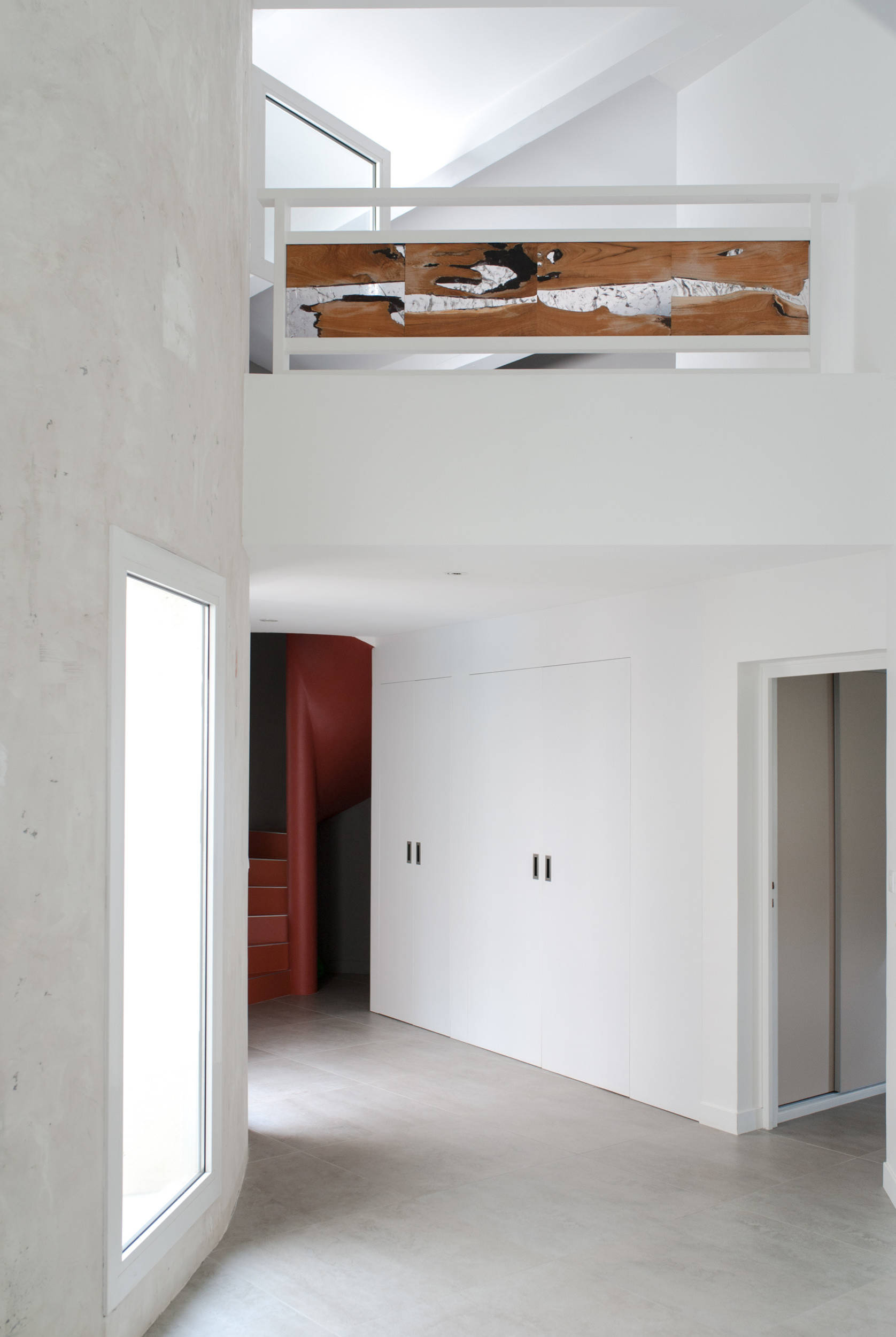 Le garde-corps de l’étage est une pièce très intéressante, presque une œuvre d’art, qui mêle teck et résine transparente. C’est une réalisation d’une société que Sonia a découverte sur le salon Maison&Objet. La structure qui l’encadre a été fabriquée sur mesure par un ferronnier.