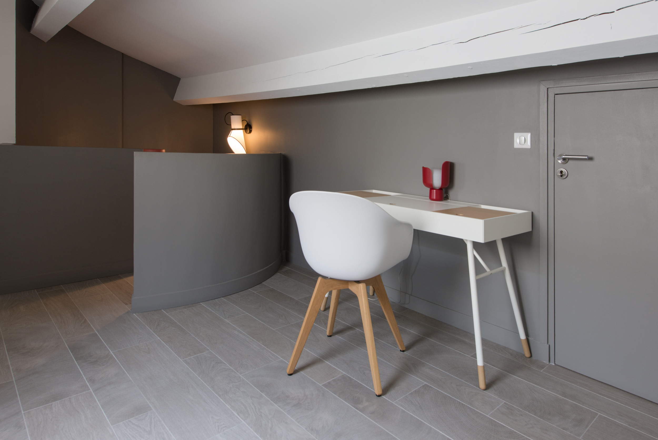 Des appliques cargo apportent une touche atelier, dans cette petite pièce sous-pente pensée comme un boudoir, avec des teintes neutres. Si les poutres sont devenues blanches pour ne pas écraser l’espace restreint, les murs ont été peints dans le même gris que le garde-corps de l’escalier, créant une continuité. Au sol, un carrelage imitation bois apporte de la chaleur.
