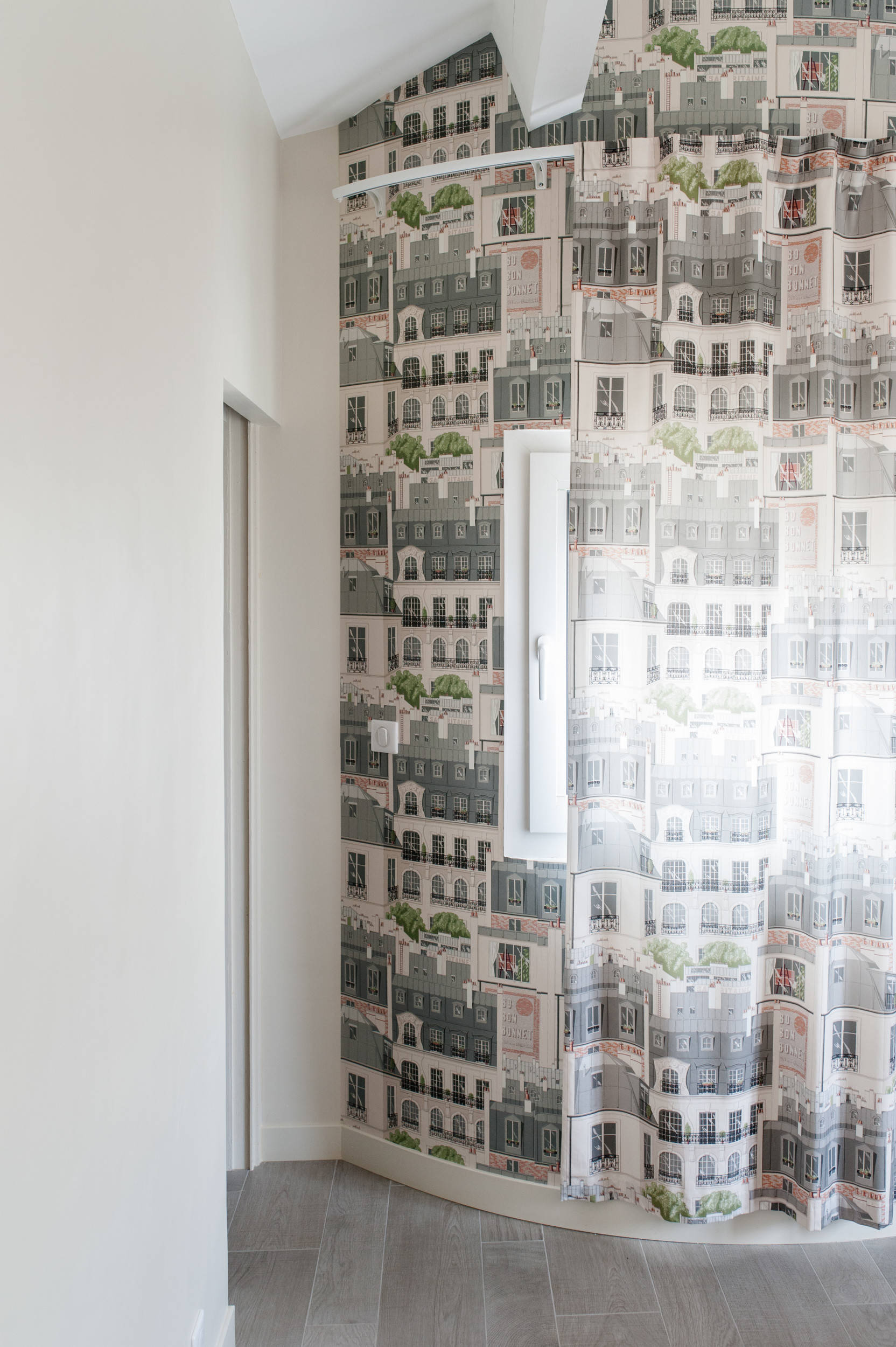 Dans la chambre parentale située à côté, une des fenêtres se trouve sur un mur arrondi. Pour épouser cette forme douce, un papier peint a été associé à des rideaux assortis, reprenant le thème des toits de Paris, pour créer une unité murale. « Un vrai défi : il a fallu faire intervenir un tapissier pour installer une tringle arrondie et obtenir un retombé parfait du tissu. »