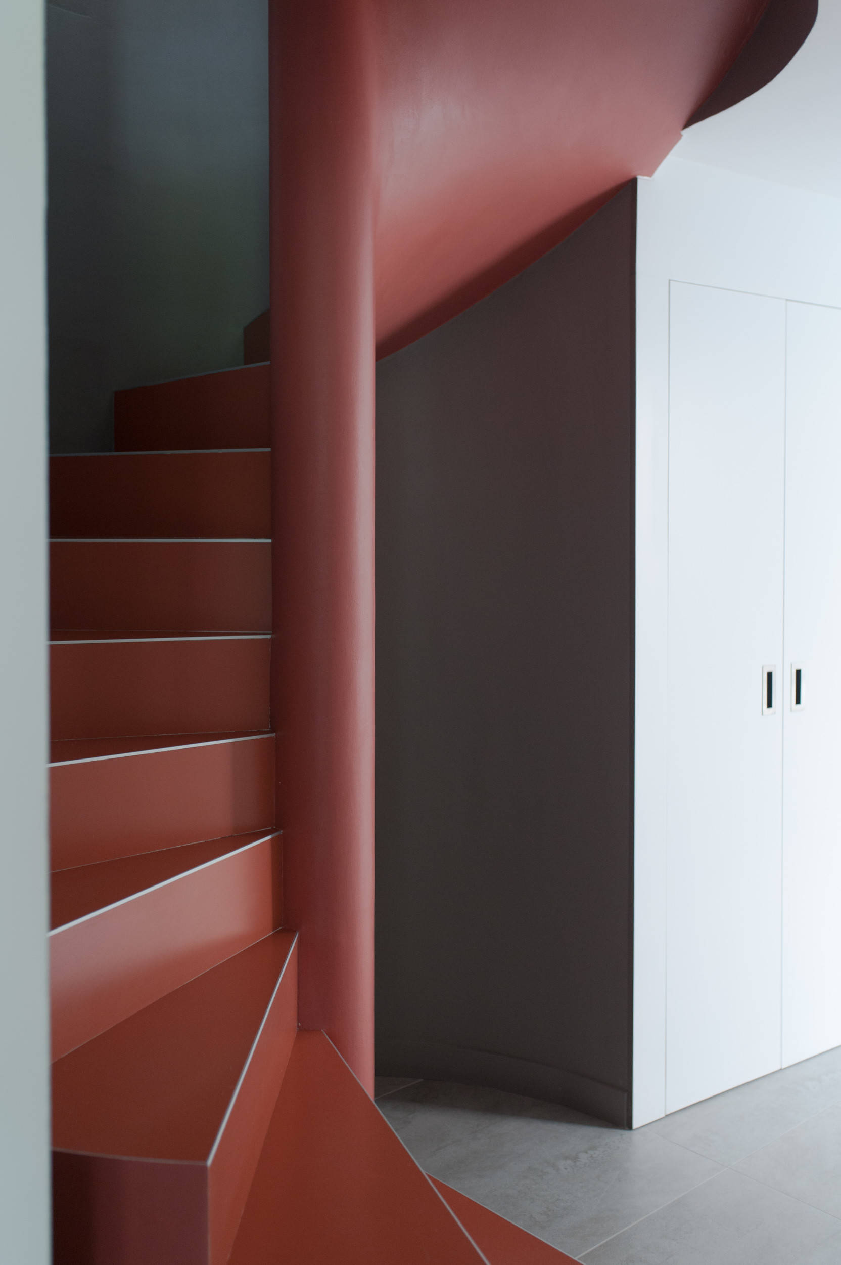 L’escalier, complètement maçonné et précédemment recouvert d’un carrelage daté, a demandé un gros travail. « J’ai vraiment étudié les différentes possibilités entre le béton et le carrelage pour un rendu parfait », affirme Sonia. Ce sont finalement ces grandes dalles de carrelage sans joint au milieu des marches qui ont gagné la bataille. La couleur orange, qui varie selon la lumière, donne un vrai caractère à cet élément massif, qui existe désormais comme une entité à part entière.