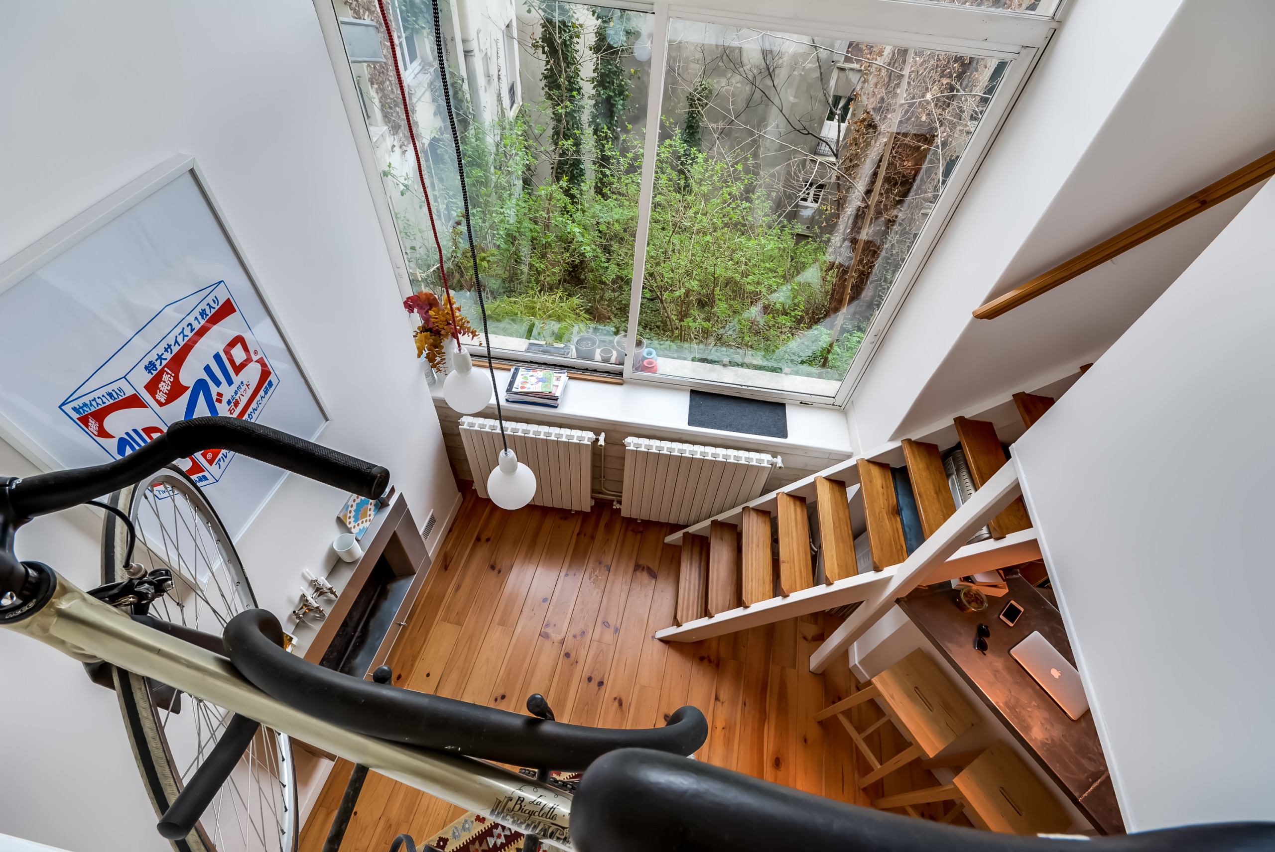 L’ancien atelier est orienté plein nord avec pour conséquence une lumière qui ne bouge pas, d’où l’intérêt pour les artistes. La grande baie vitrée ouvre l’espace sur le maquis de Montmartre. « Nos voisins ont créé une ouverture pour y descendre », explique Laurent. « On a une sorte de dalle de 1,5 m de large. Cela fait comme un coin terrasse qui donne sur le maquis. C’est un espace en plus dans l’appart. Le soir, de temps en temps, on invite des copains et on prend un verre. » Derrière l’escalier, le bar abrite l’espace cuisine.