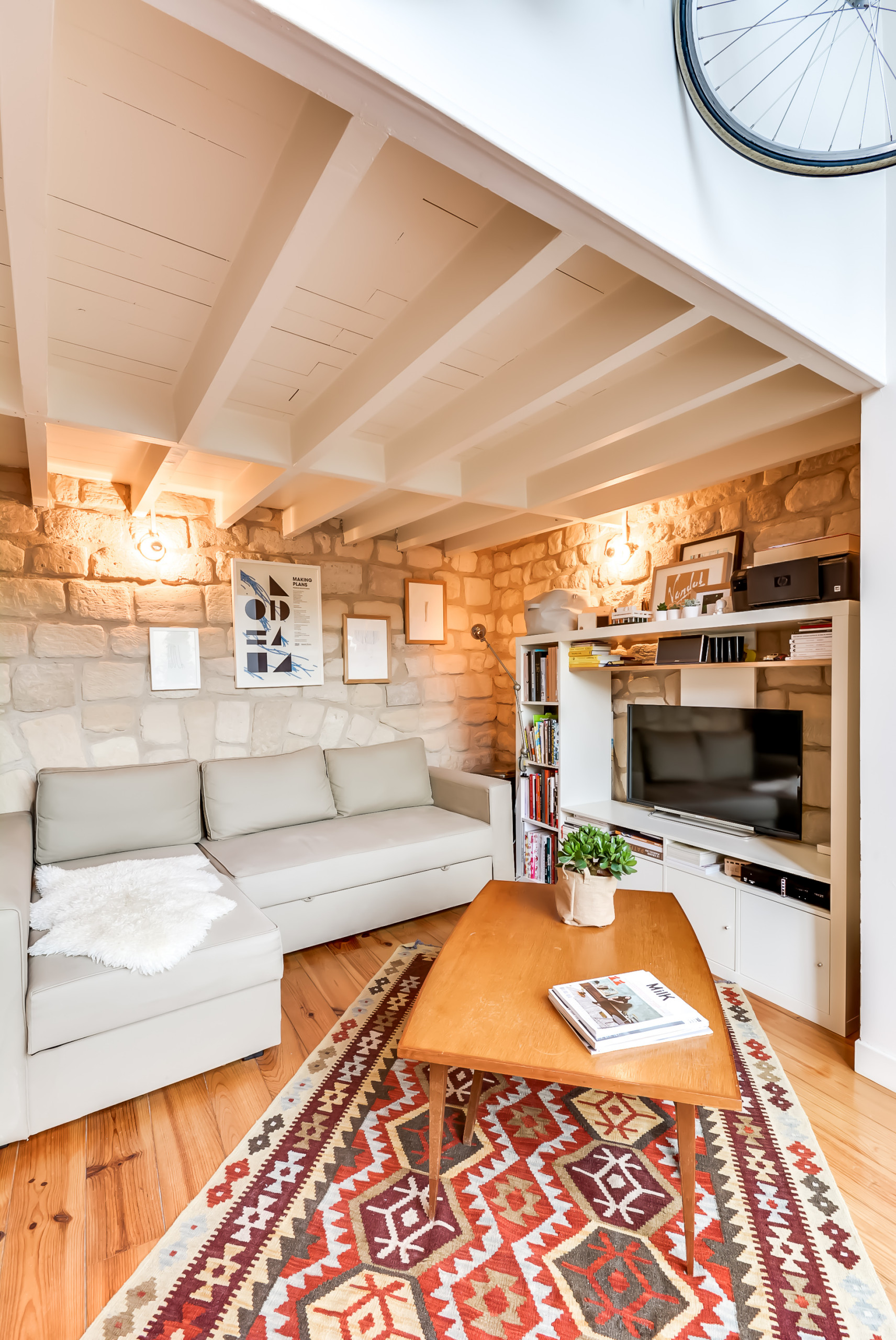 Flashback. Il y a un peu plus de quatre ans, Laure, consultante en communication digitale, et Laurent, architecte décorateur, vivent dans le studio de Laurent, dans le XXe arrondissement. Ils décident alors de trouver leur nid commun. S’ensuit le parcours classique du locataire en herbe : annonces, visites, « presque un job à plein temps », s’amuse Laurent. Quelques photos suffiront pourtant au couple pour s’amouracher de ce duplex de la butte Montmartre, aussitôt accolé de la mention « coup de cœur ». Il y a bien sûr le charme des poutres et de la pierre. Il y a aussi la profondeur innée d’un espace qui fut, il y a des années, un atelier d’artiste dans un quartier creuset de création depuis des décennies. Mais l’essentiel est ailleurs. Coupé de la fureur de la ville, on dirait que l’appartement s’est fait la malle pour prendre la clé des champs. De l’autre côté de la baie vitrée, le vert prédomine. Une petite terrasse accompagne les soirées d’été. Ici, tout est tranquille.