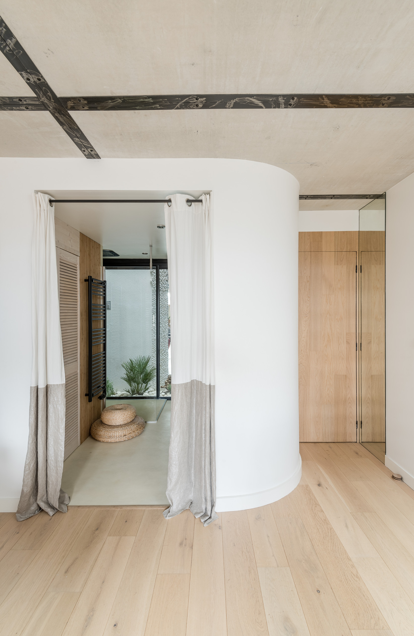 Tout au bout du rez-de-chaussée, une cloison cintrée dessine le volume de la salle de bains tandis que la porte de droite donne accès aux toilettes.