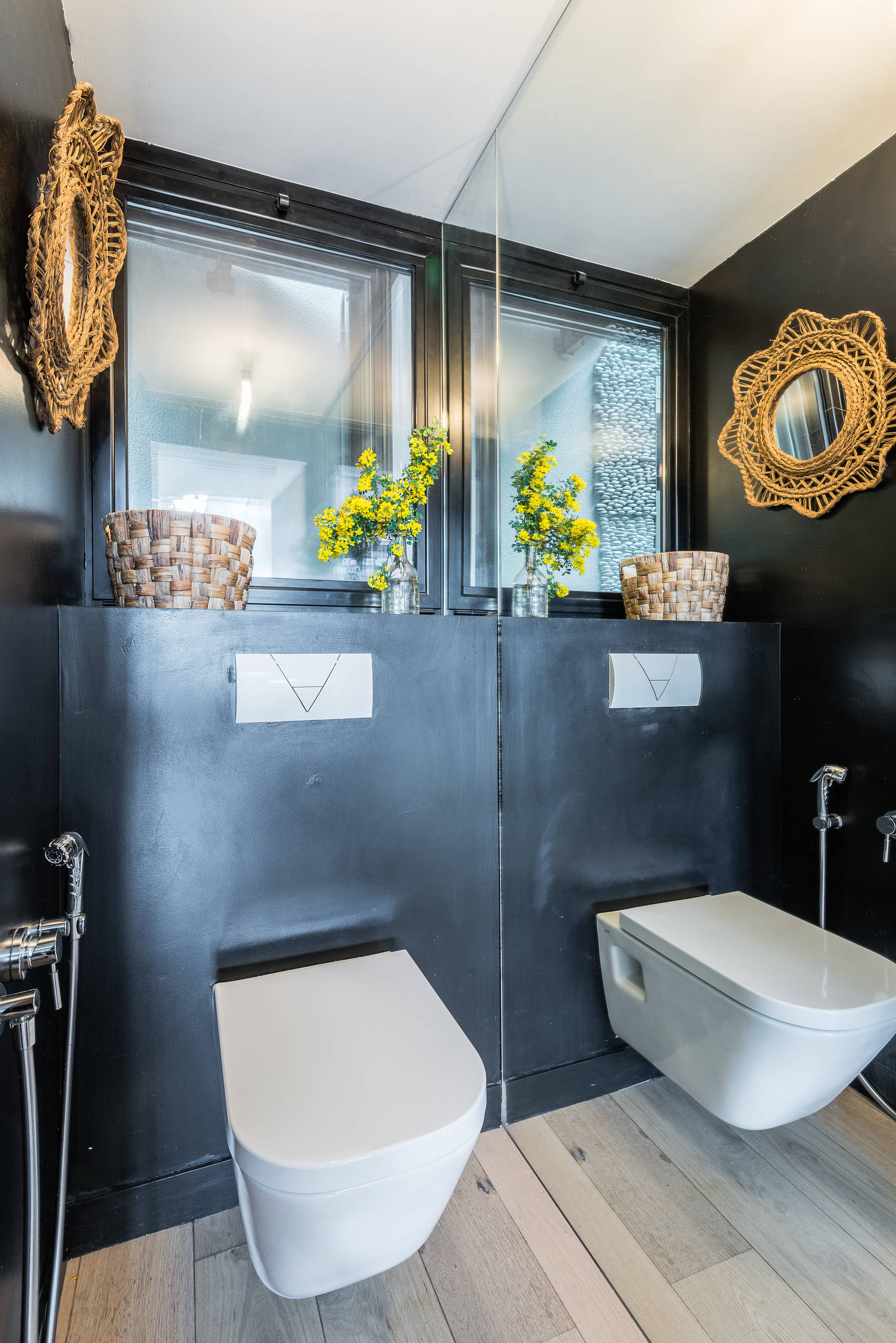 Pour donner de la profondeur aux toilettes, elles ont été tapissées d’un miroir sur tout un pan de mur. Elles sont bien éclairées et ventilées grâce à l’ouverture au-dessus du bâti-support qui donne sur l’espace tampon. Elles disposent d’une douchette et d’un lave-mains en renfoncement.