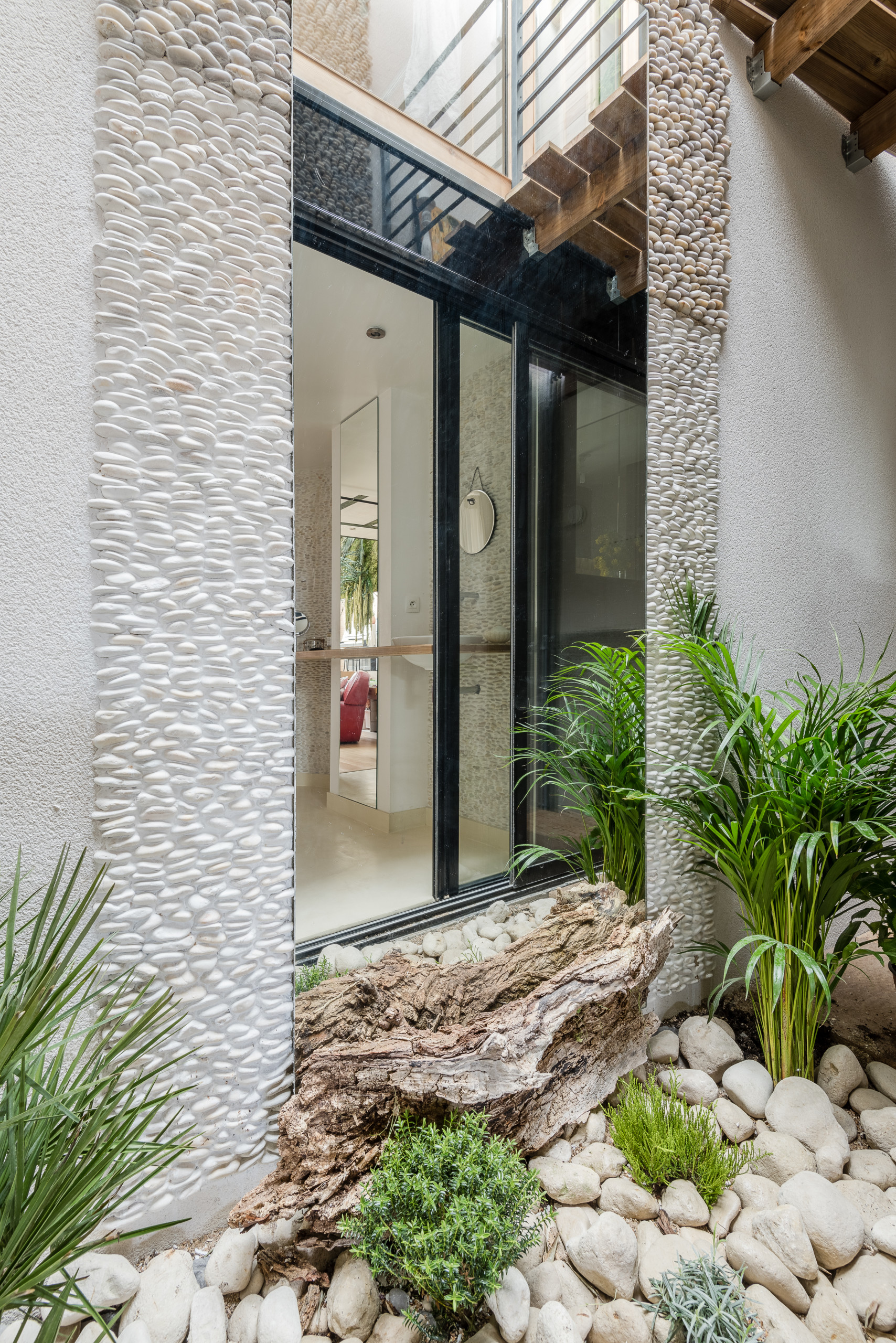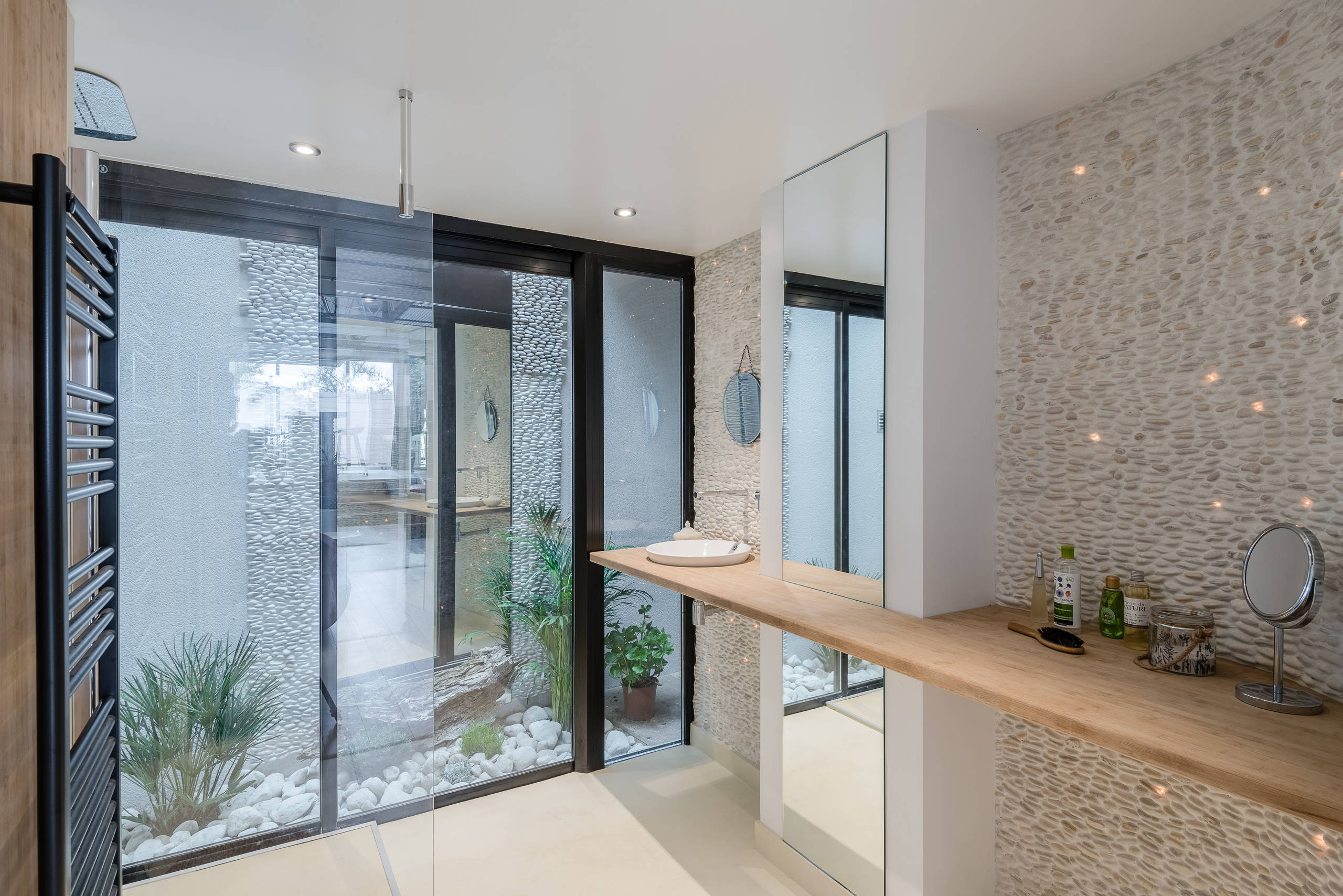 La salle de bains, conçue dans un esprit zen et minimaliste, n’est pas sans évoquer l’univers d’un spa à Bali. Elle s’ouvre sur un jardin minéral aménagé dans une zone tampon d’environ un mètre de large sur toute la hauteur se situant au fond de la parcelle.