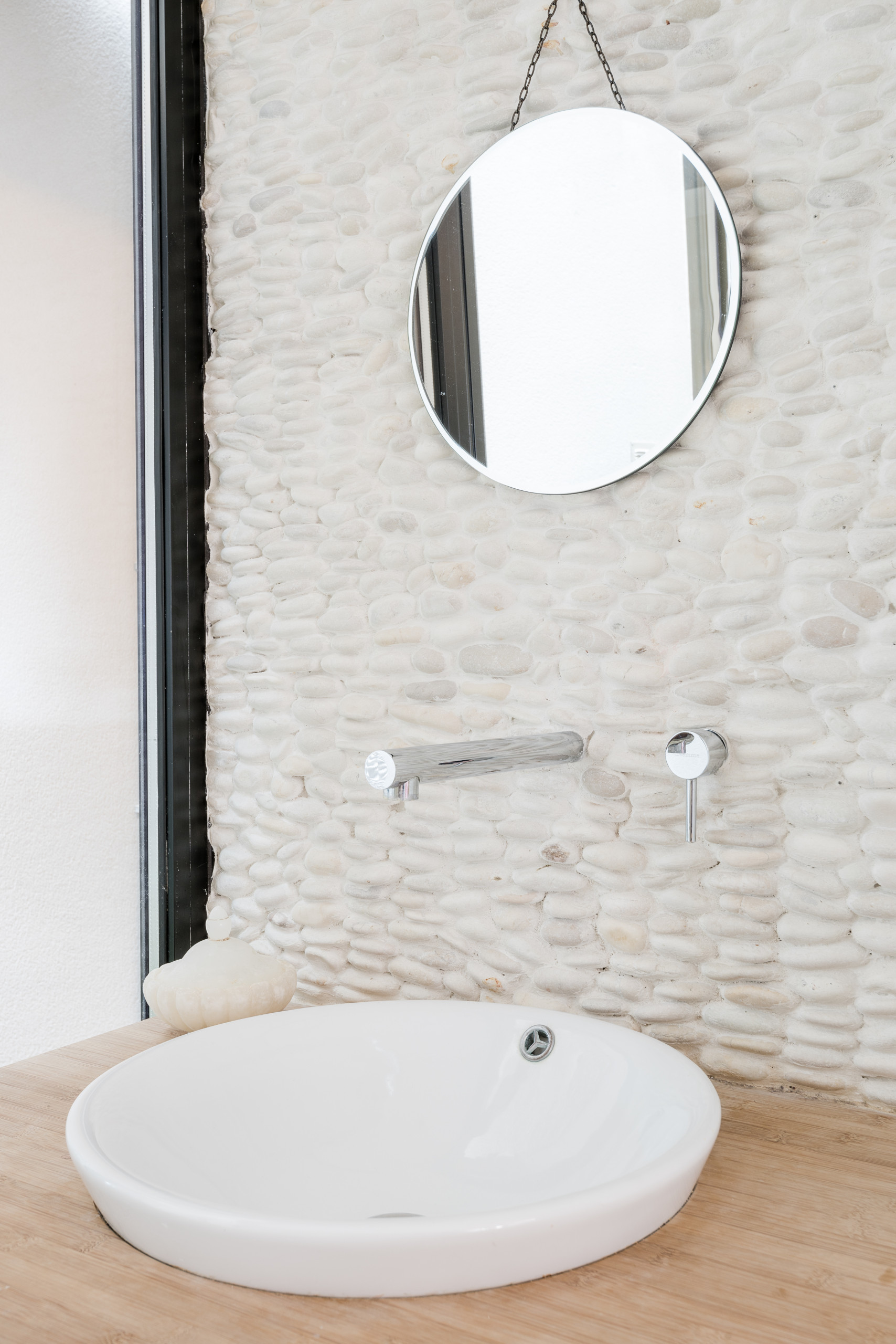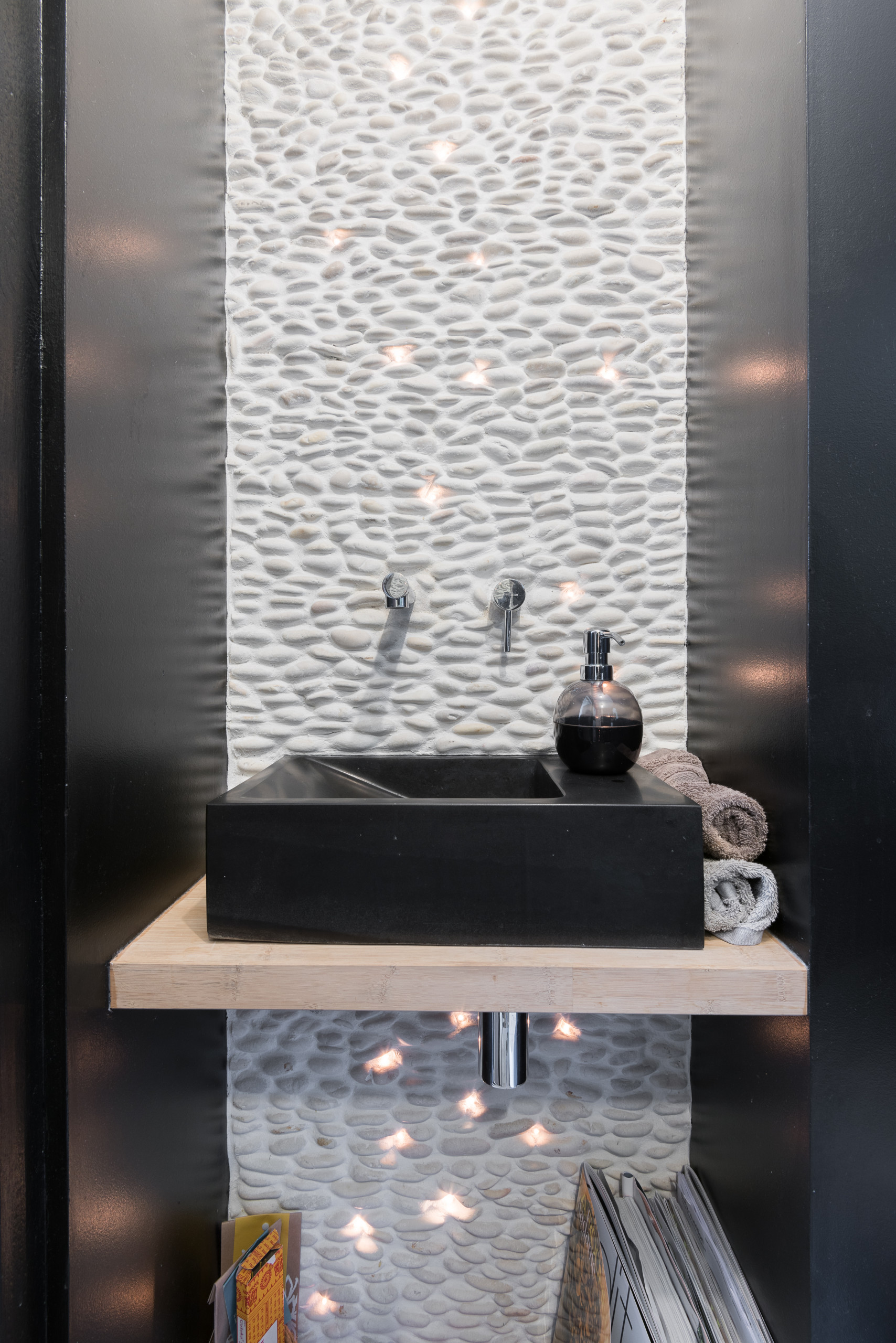 Le lave-mains est en pierre naturelle et la robinetterie encastrée pour un effet fontaine. On retrouve ici les mêmes préoccupations poétiques que dans la salle de bains.