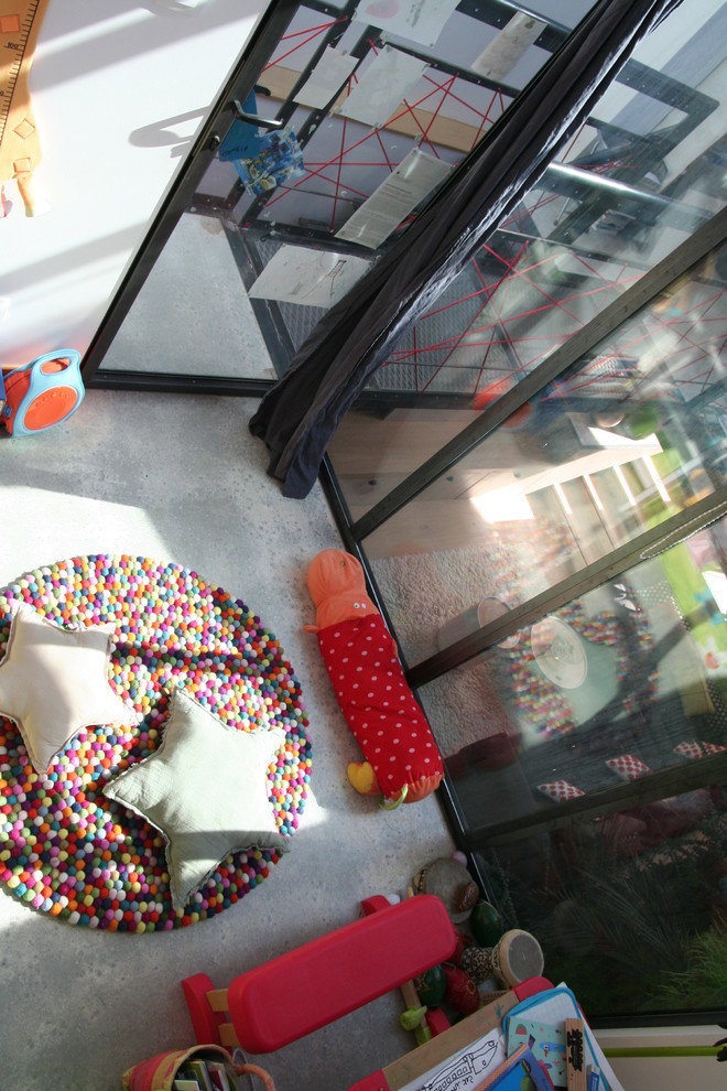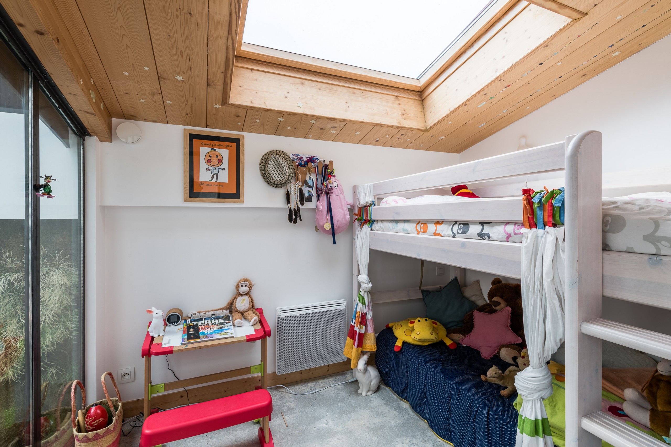 La chambre de Diego est petite (6 m²) mais lumineuse. La grande baie atelier vitrée juste en face du bureau de Nadège donne sur le mur végétal, si bien que l’on se sent pas du tout à l’étroit. On aperçoit un radiateur électrique (panneau radiant) qui sert d’appoint l’hiver. Le Velux peut être occulté électriquement et la baie manuellement par des stores.