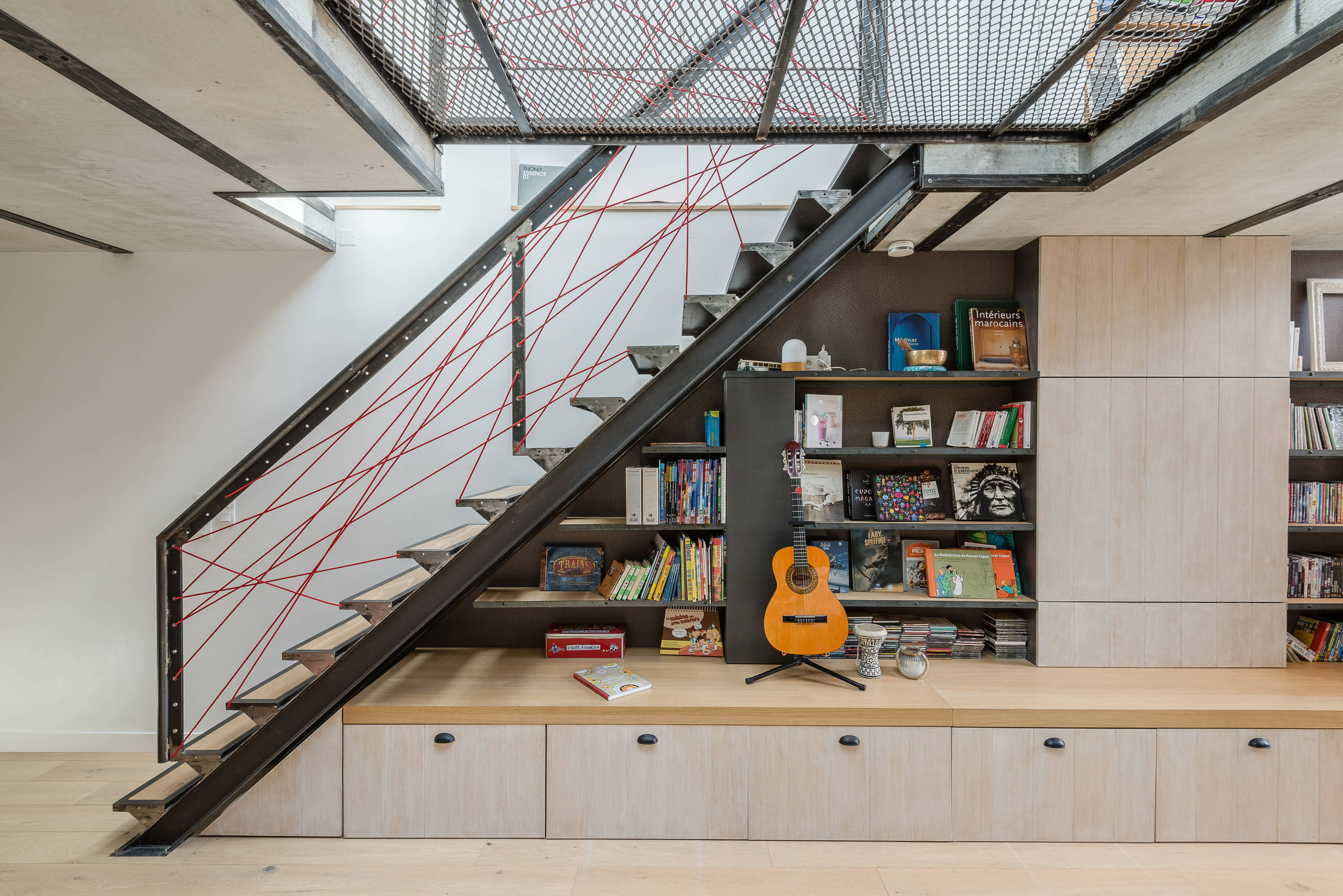 L’escalier de métal, fabriqué par un ferronnier à base d’IPN, longe le nouveau mur structurel désolidarisé du mitoyen. Pour ne pas perdre d’espace, une grande bibliothèque sur mesure a été aménagée en dessous. Nadège l’a imaginée avec un soubassement qui sert de banquette quand elle reçoit et cache des tiroirs sur roulettes pour tout ranger. Elle dispose également de rayonnages ouverts et d’un panneau coulissant qui dissimule la télévision.