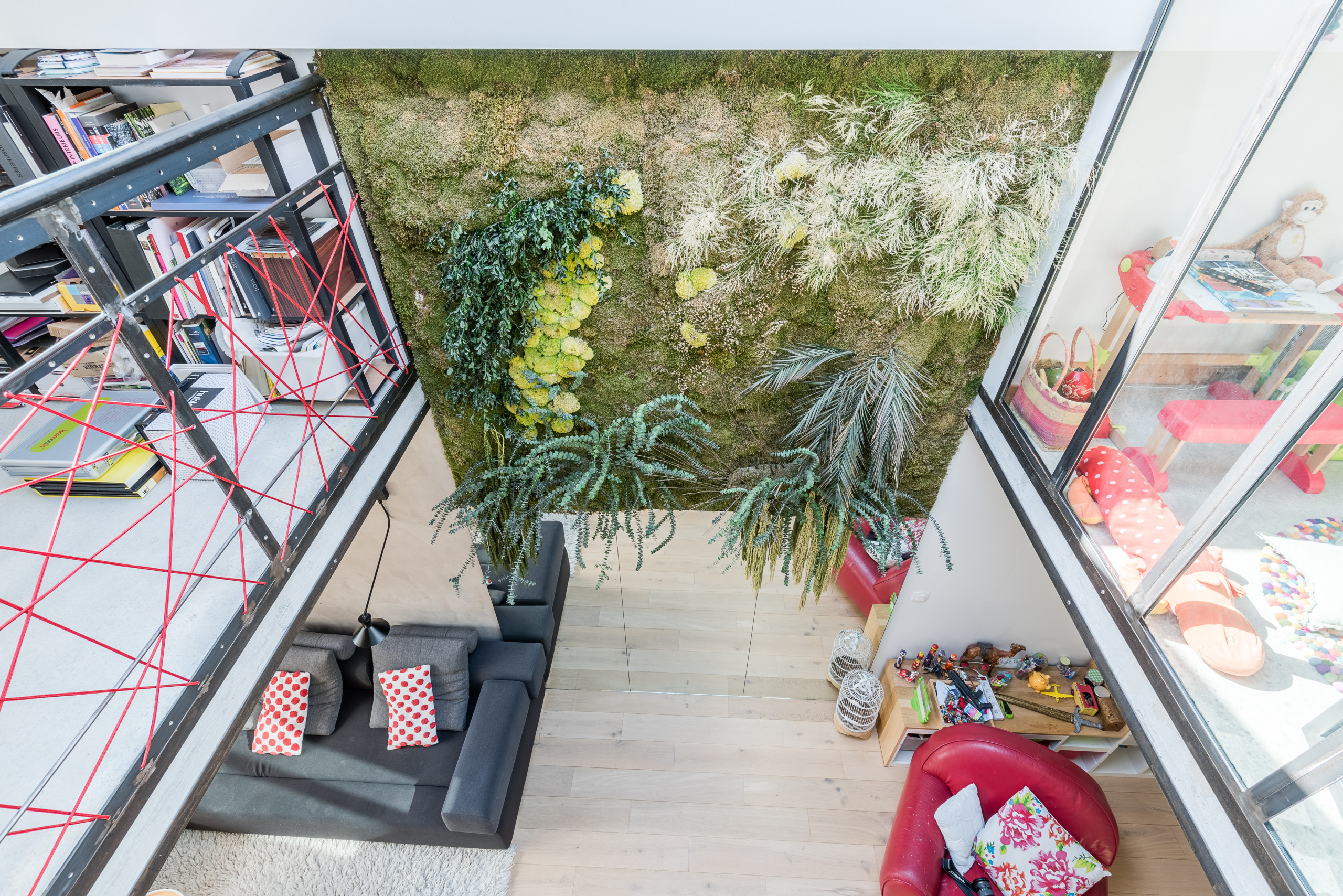 Étant donné que Nadège ne pouvait pas avoir de vrai jardin par manque d’espace, elle a rêvé d’un mur végétalisé comme ceux du botaniste Patrick Blanc, leur inventeur, dont elle admire l’œuvre : « Il a fallu revenir à la réalité. Le système d’irrigation était difficile à mettre en œuvre et coûtait très cher. Je me suis rabattue sur des végétaux stabilisés, des eucalyptus, de l’amarante et de la mousse végétale. Ils sont traités avec une solution qui les garde intacts pendants dix ans sans soin. Le mur de 5 m² m’a coûté 5 000 euros environ. »