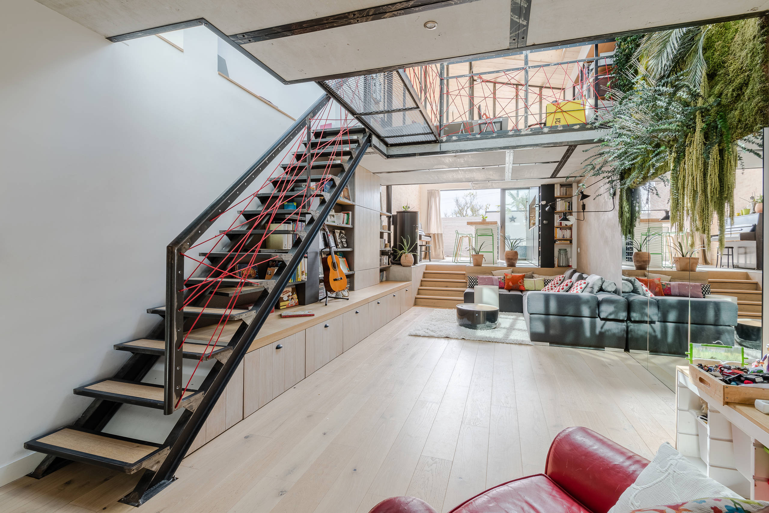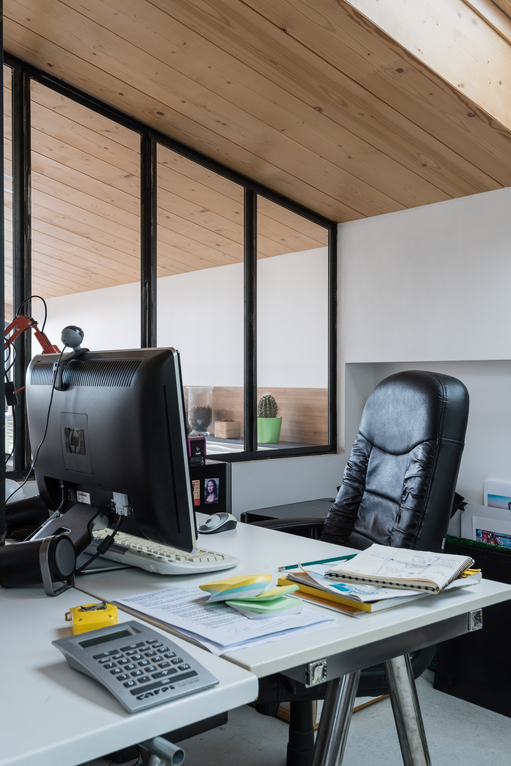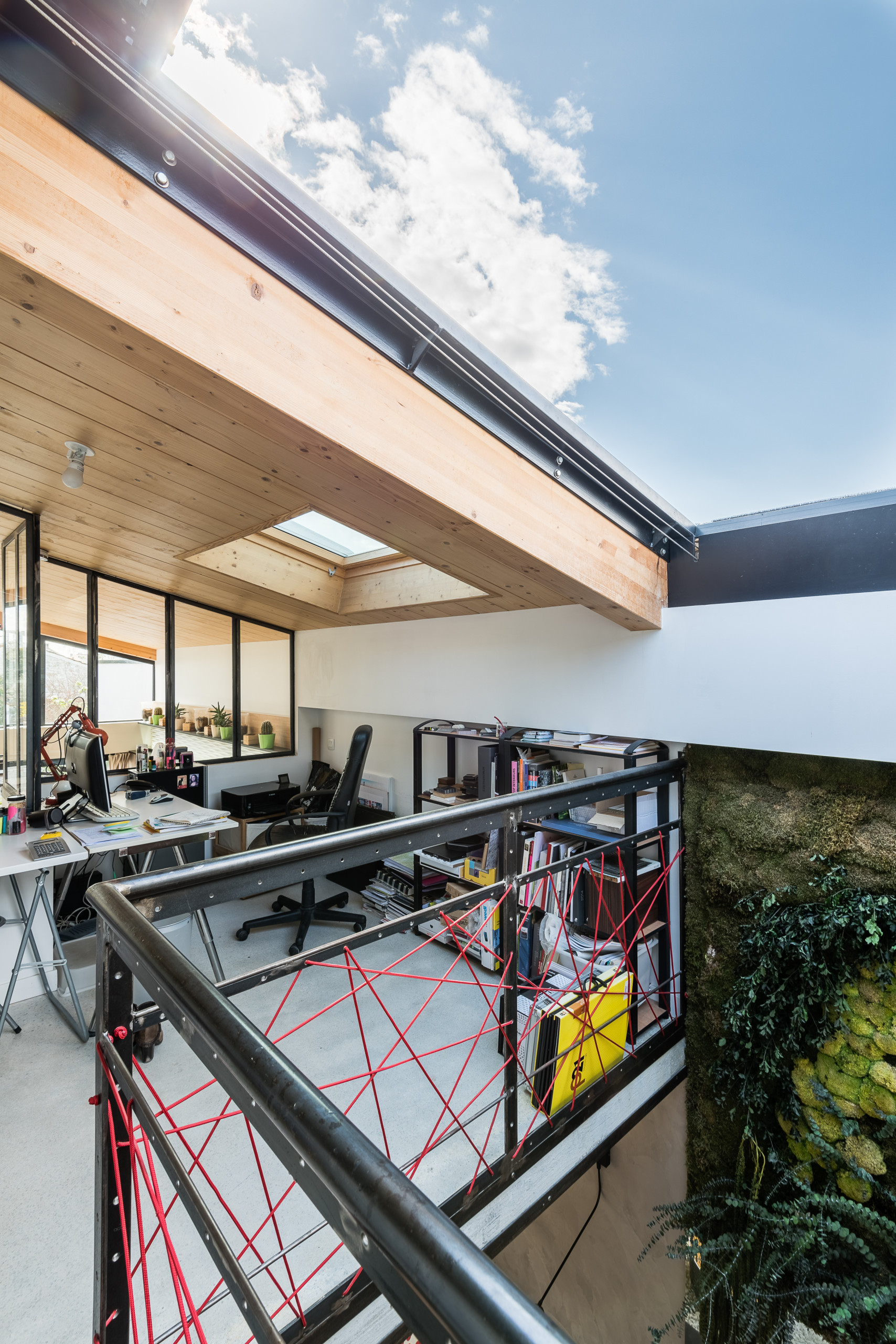 En haut de l’escalier, la plateforme au-dessus du salon sert de bureau à l’architecte qui travaille à la maison. Un Velux juste au-dessus de son bureau rend l’espace très lumineux. Il peut être occulté par un système électrique.