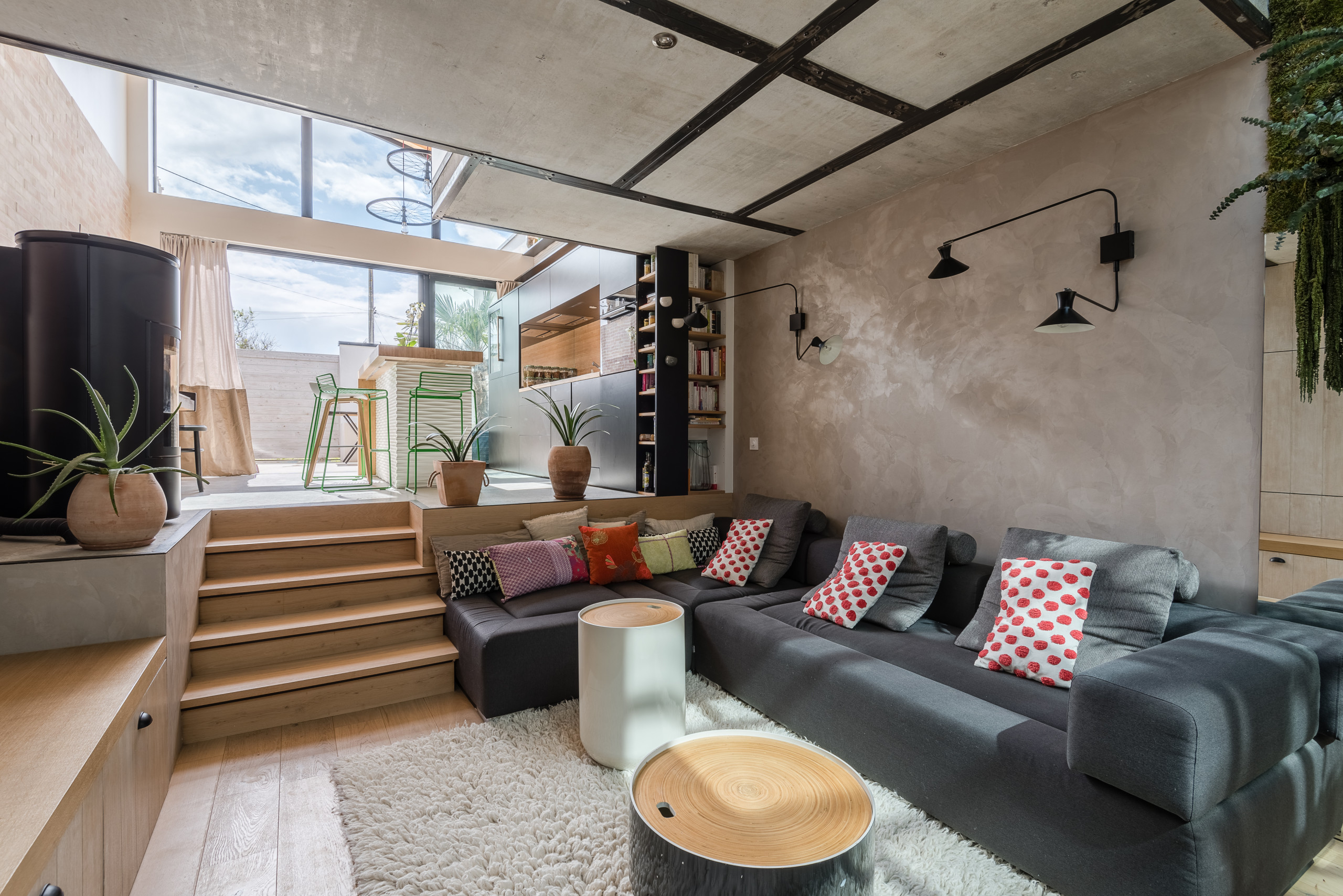 Il en résulte un coin intime et chaleureux, rendu très cosy par un canapé modulable contemporain éclairé par des appliques métalliques de style Mouille. L’effet industriel est au rendez-vous grâce au conduit apparent du poêle et à la chape de béton brut de l’étage dont on voit encore les empreintes des bois de coffrage. Les fers plats, ajoutés pour cacher les traces de ruban adhésif des banches, apportent un bel effet graphique. Derrière le canapé, le mur a été enduit de chaux couleur laiton. Le sol a été couvert de parquet de chêne contrecollé pour plus de chaleur.