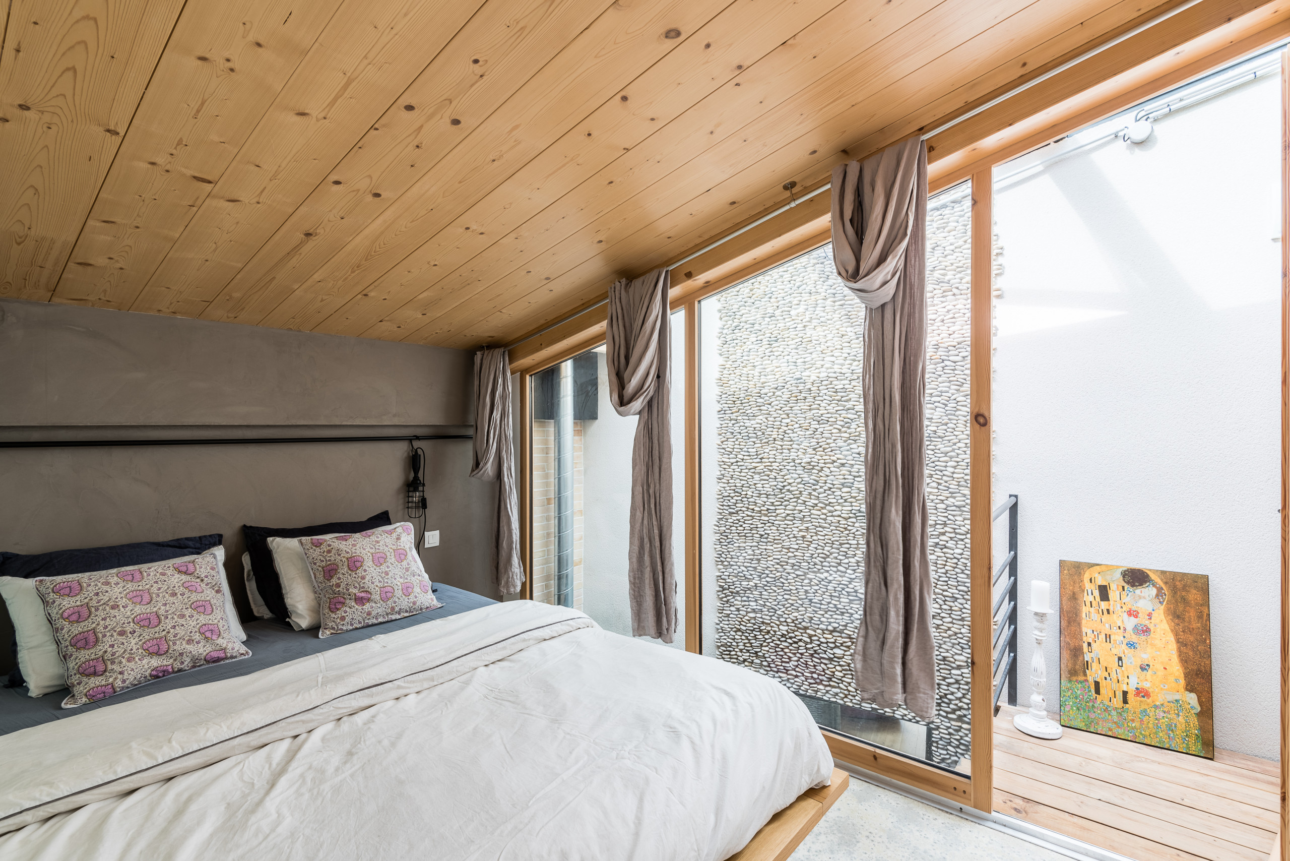 Voici la chambre parentale, lambrissée de pin au plafond, enduite d’enduit à la chaux chocolat au niveau de la tête de lit et tapissée de papier effet tie and dye sur un côté : « Je voulais recréer une ambiance bohème chic sans dépenser trop d’argent. Le papier peint vient d’une grande surface. Les porte-bijoux sont des moulures en polystyrène que j’ai peintes et auxquelles j’ai ajouté des poignées. J’ai complété l’ambiance par des rideaux en lin froissés. »