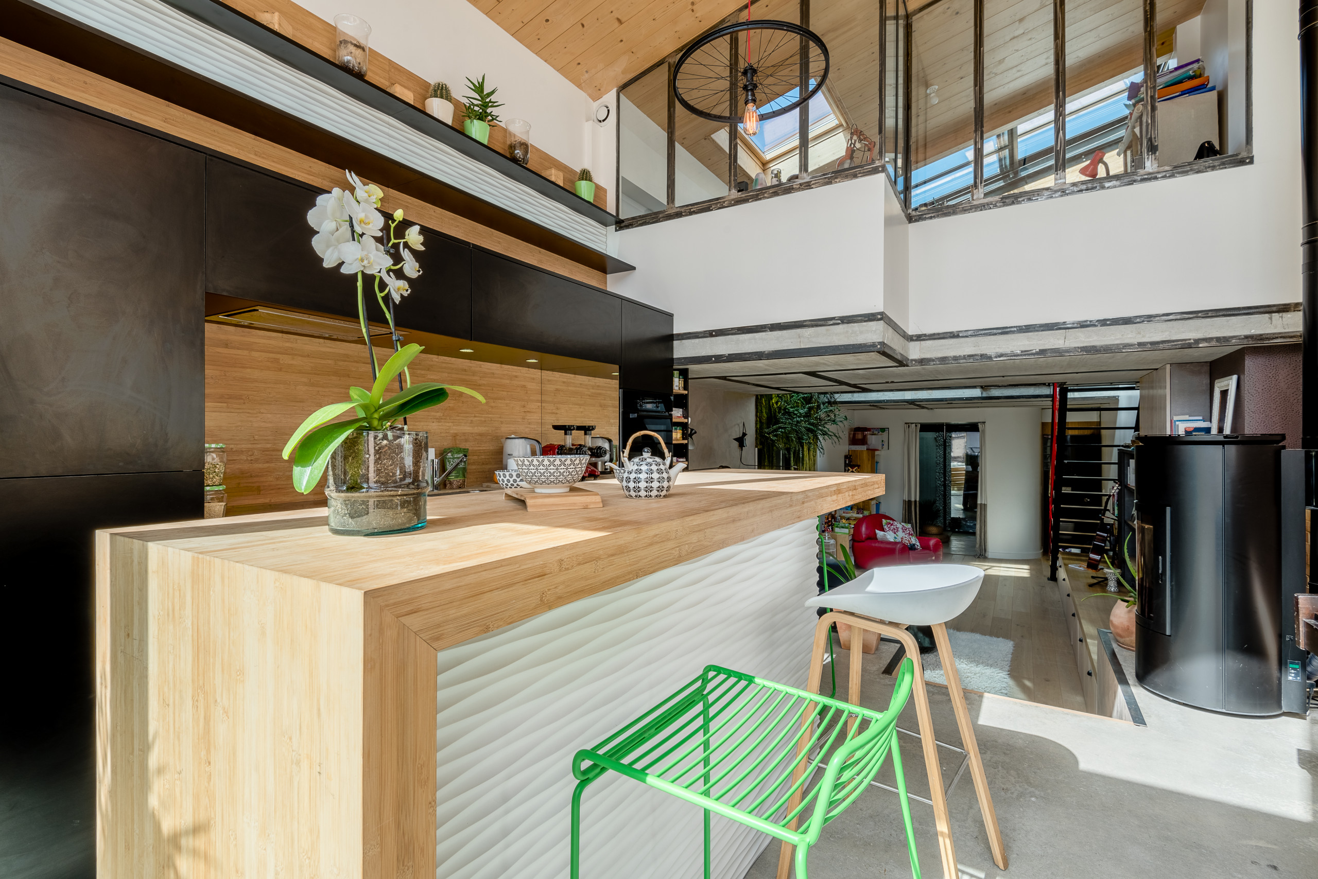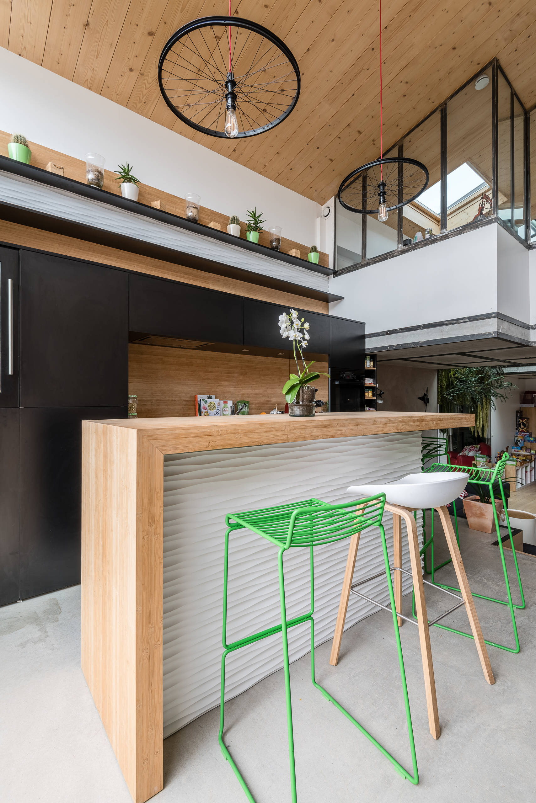 Les suspensions d’un style industriel sont une œuvre de Nadège : elle les a fabriquées avec de vieilles roues de vélo et une LED qui imite les ampoules à filament.