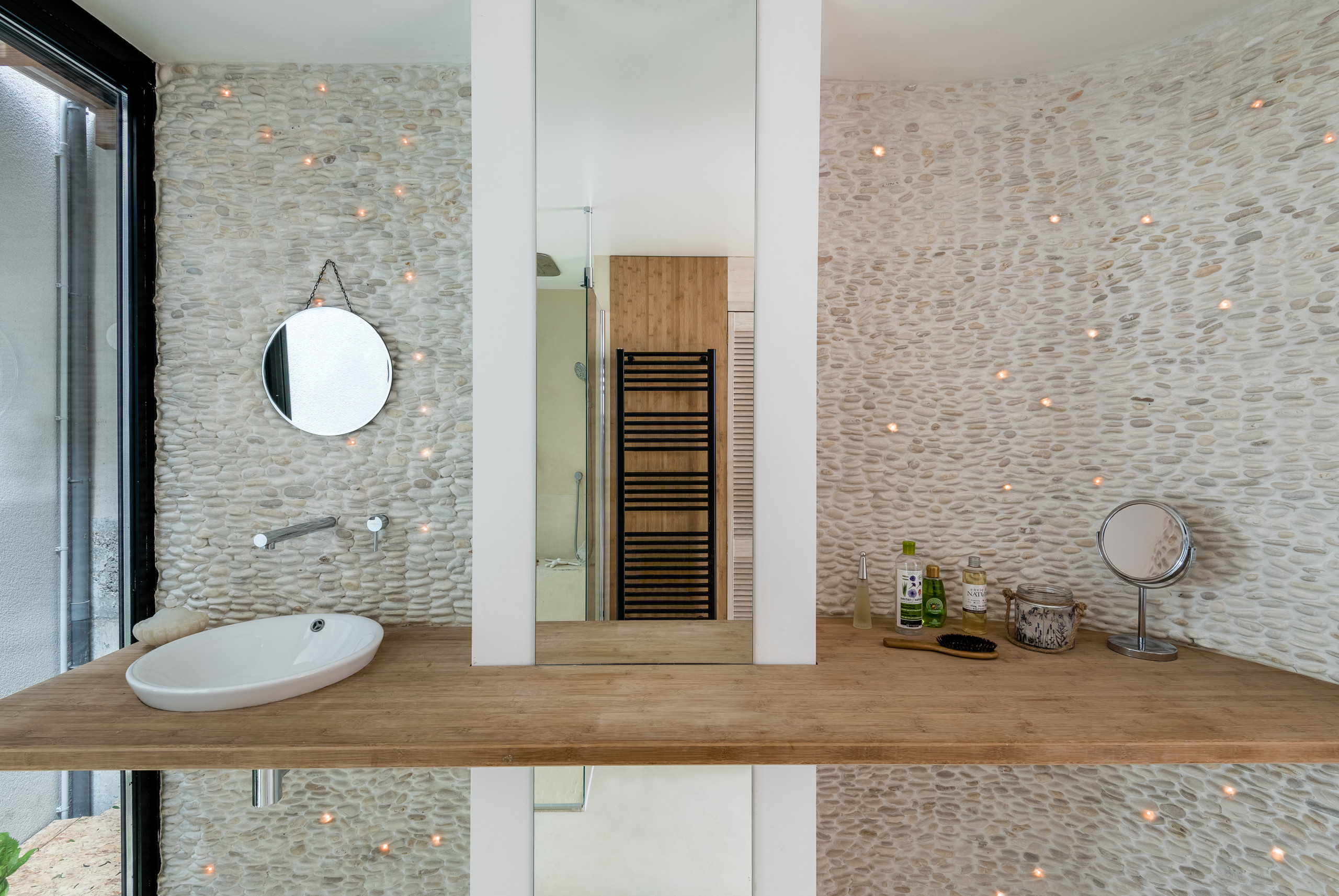 en pied pour apporter de la profondeur et de l’élégance, sans oublier la touche de poésie : les calades ont été percées çà et là pour y accueillir de petites LED qui illuminent la pièce telles des lucioles. Tout a été pensé pour susciter le rêve et la détente.