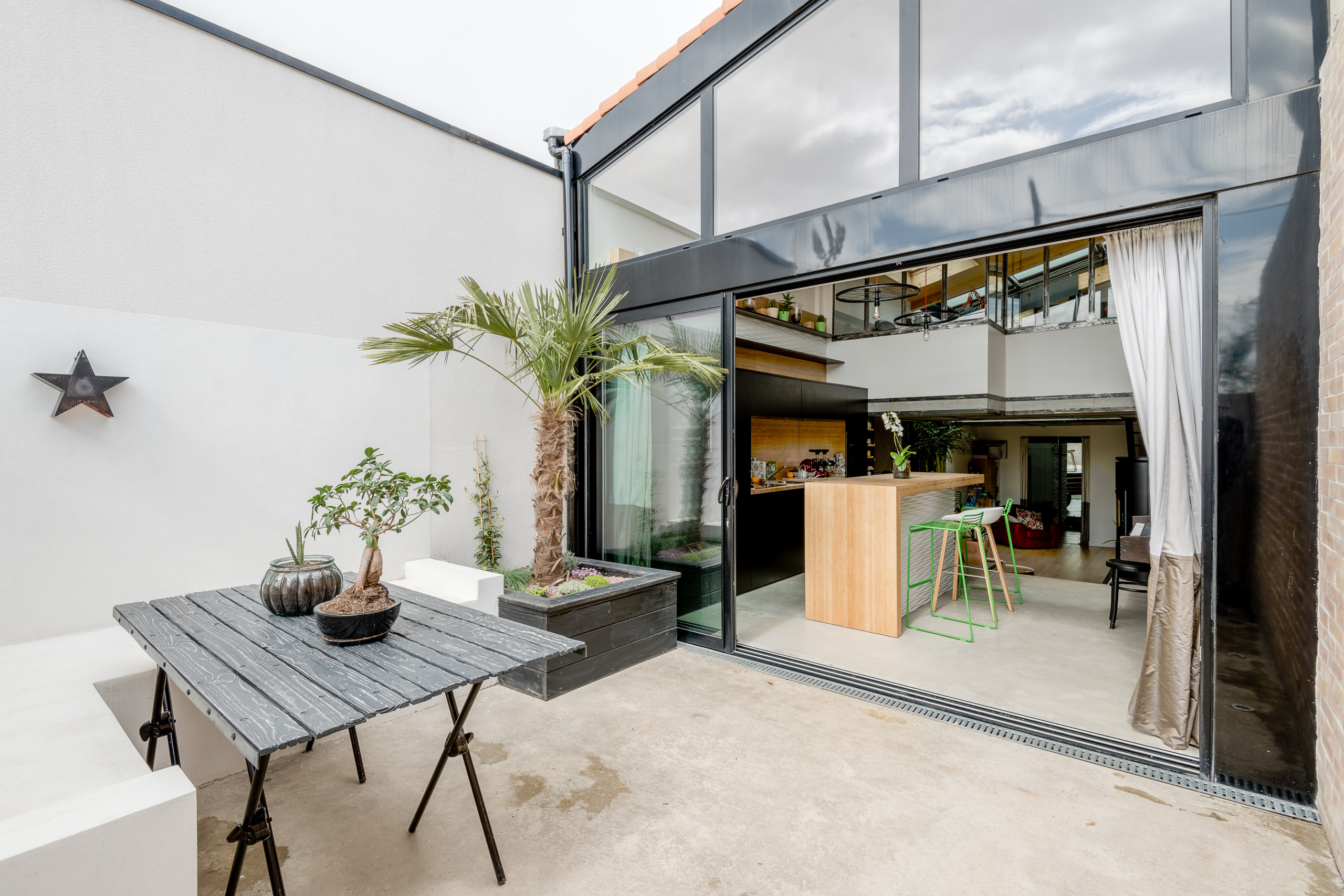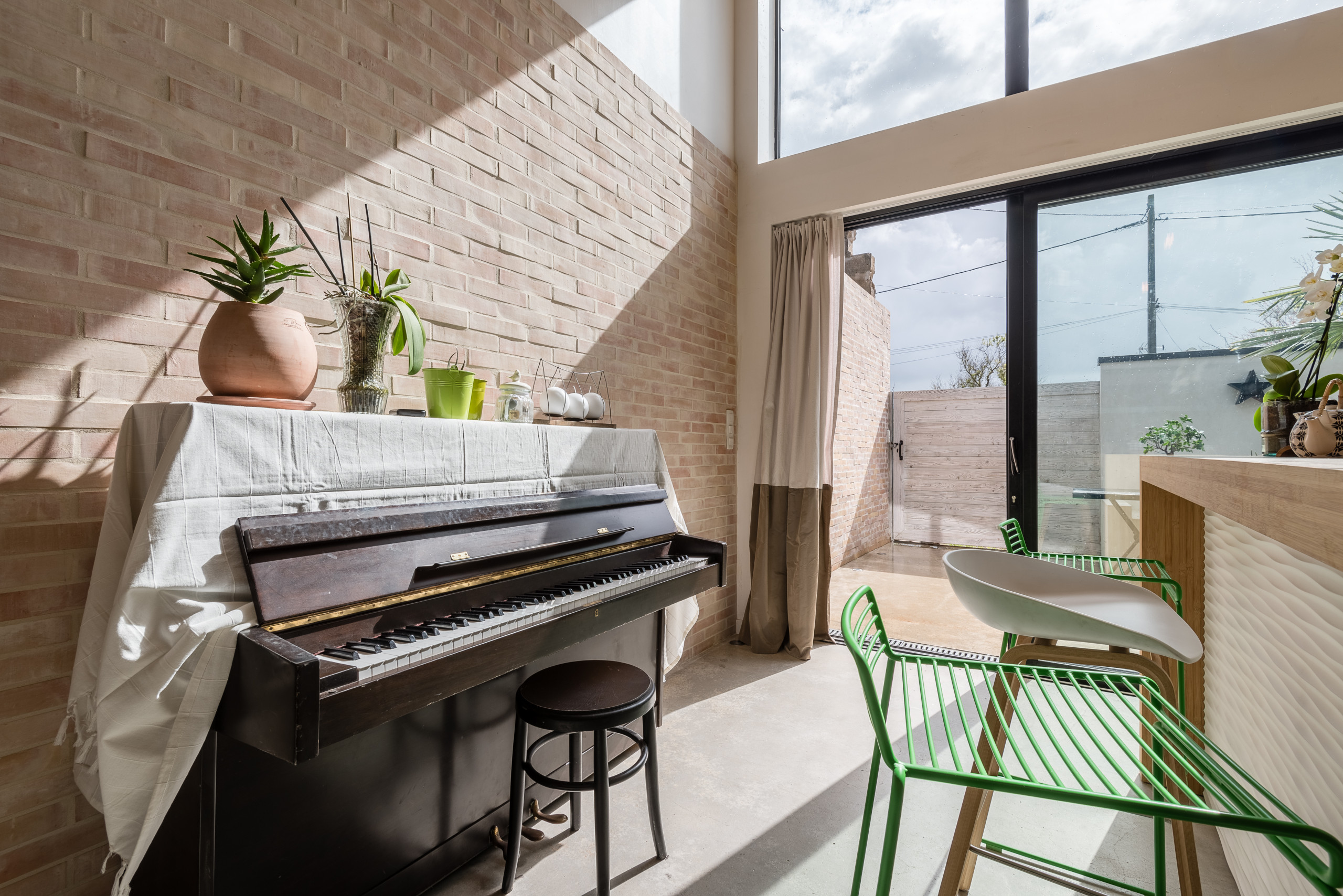 La courette de 4 x 4 mètres a été conçue de concert avec la cuisine qui se situe juste derrière : « Je voulais que la cuisine puisse se connecter au patio pour s’agrandir aux beaux jours en un salon d’été avec cuisine et îlot central attenants. Le sol en béton et le mur en briques, dedans comme dehors, ont été traités en continuité avec les mêmes matériaux pour créer l’unité. »