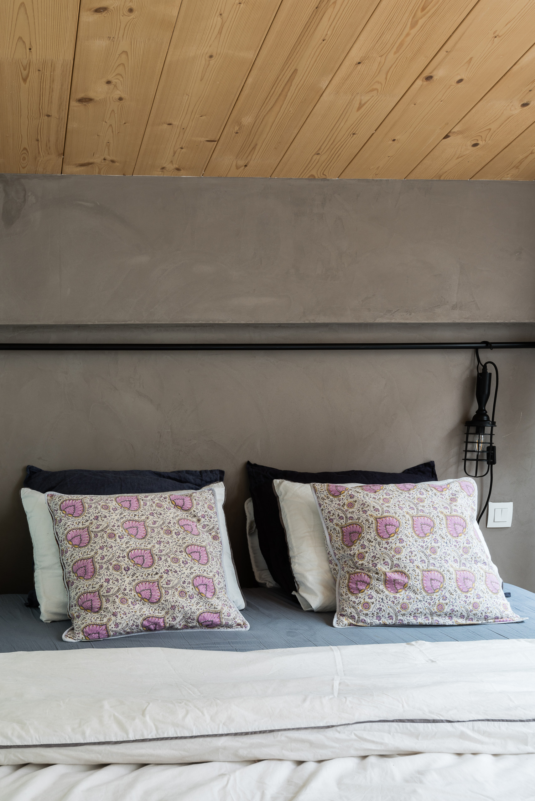 Détail de la tête de lit : une tringle toute largeur placée à mi-hauteur permet de fixer éventuellement un textile. Actuellement une baladeuse d’atelier éclaire le chevet et file la métaphore industrielle.
