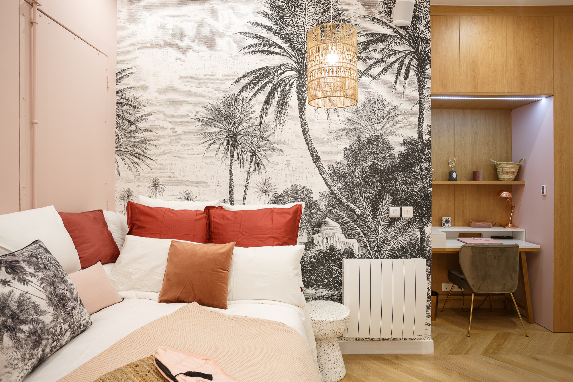 Pour créer un bureau harmonieux dans cette chambre, la tête de lit menuisée a servi de base à un prolongement en bureau avec des tablettes de la même essence. Le résultat, une idée de l’architecte Alia Bengana, est réussi et pratique et exploite un espace perdu de la chambre. En revanche, si vous devez travailler des heures durant sur ce poste, optez pour un bon fauteuil de bureau !