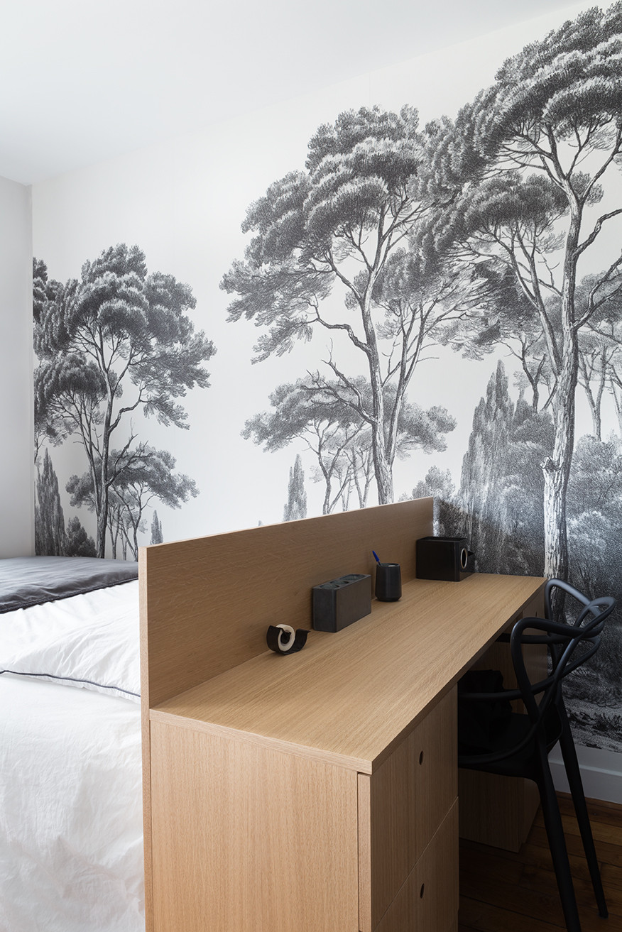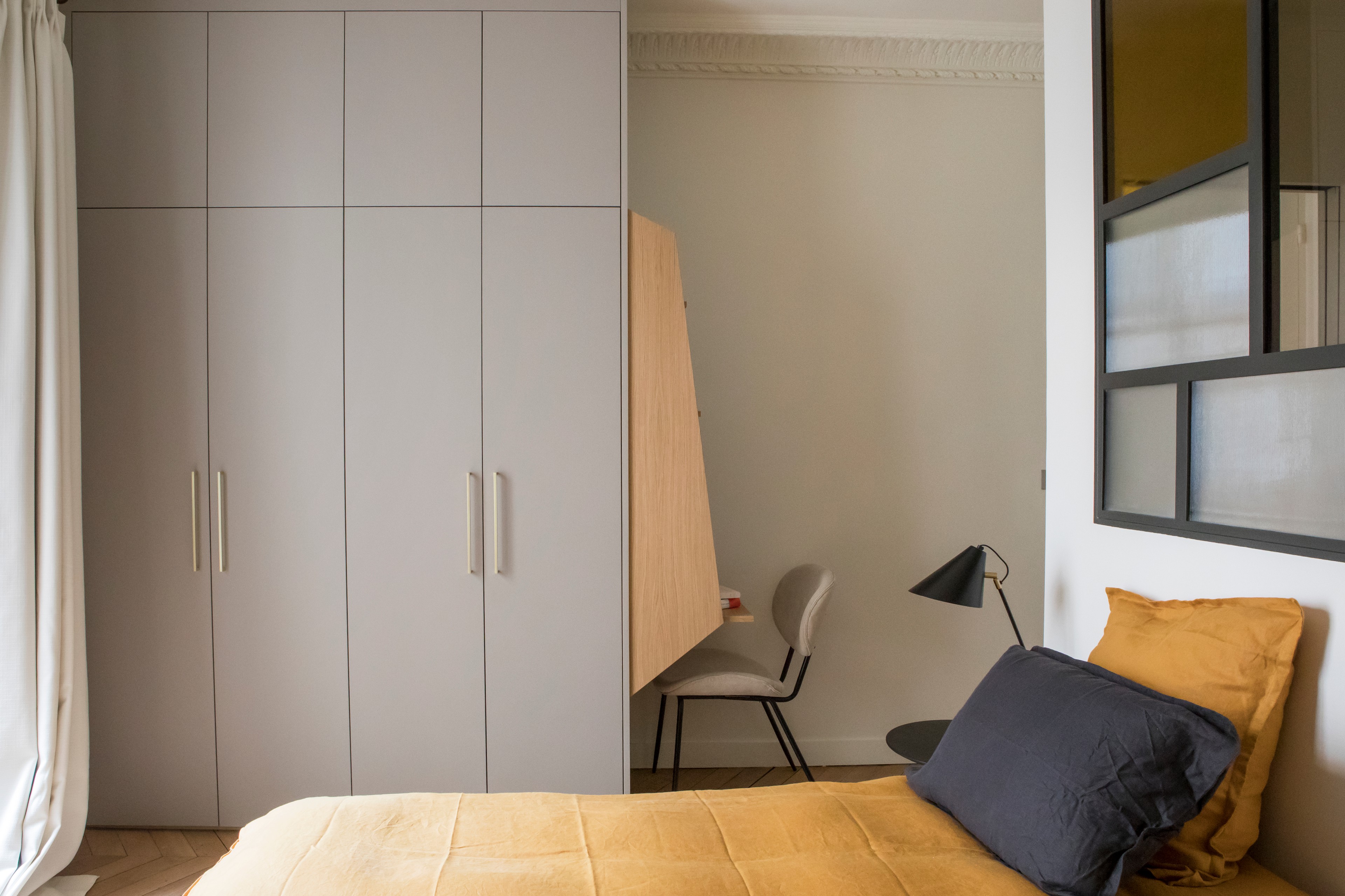 On apprécie également cette solution discrète de maéma architectes qui permet d’adapter la chambre parentale, sans la transformer pour autant en chambre d’étudiant avec grand bureau… Petit meuble peu profond, qui se glisse partout, le secrétaire permet de disposer en journée d’une tablette et de rangements pour travailler. Et quand le soir on referme la tablette, la chambre retrouve presque son allure habituelle.