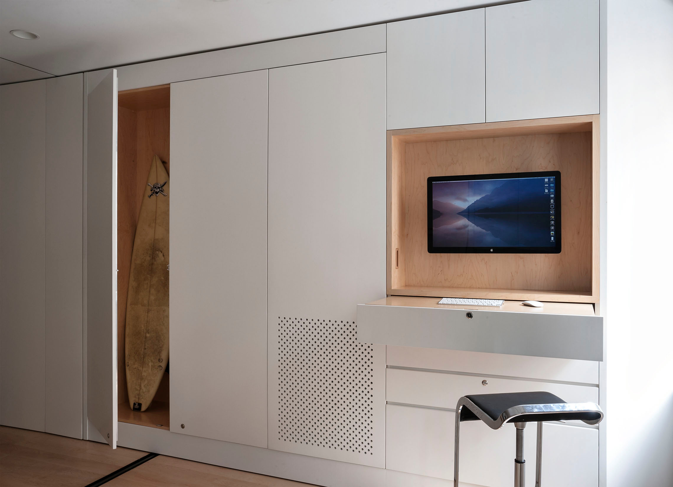 Autre solution discrète de l’architecte Malcolm Davis, repérée à San Francisco, voici le concept du lit-secrétaire. Ce lit a été fait sur mesure et sa tête de lit pensée pour travailler. Sa profondeur cache l’ordinateur et les documents de travail tandis que la tablette rabattable sert de bureau. À réserver néanmoins à ceux qui ont un dos en béton.
