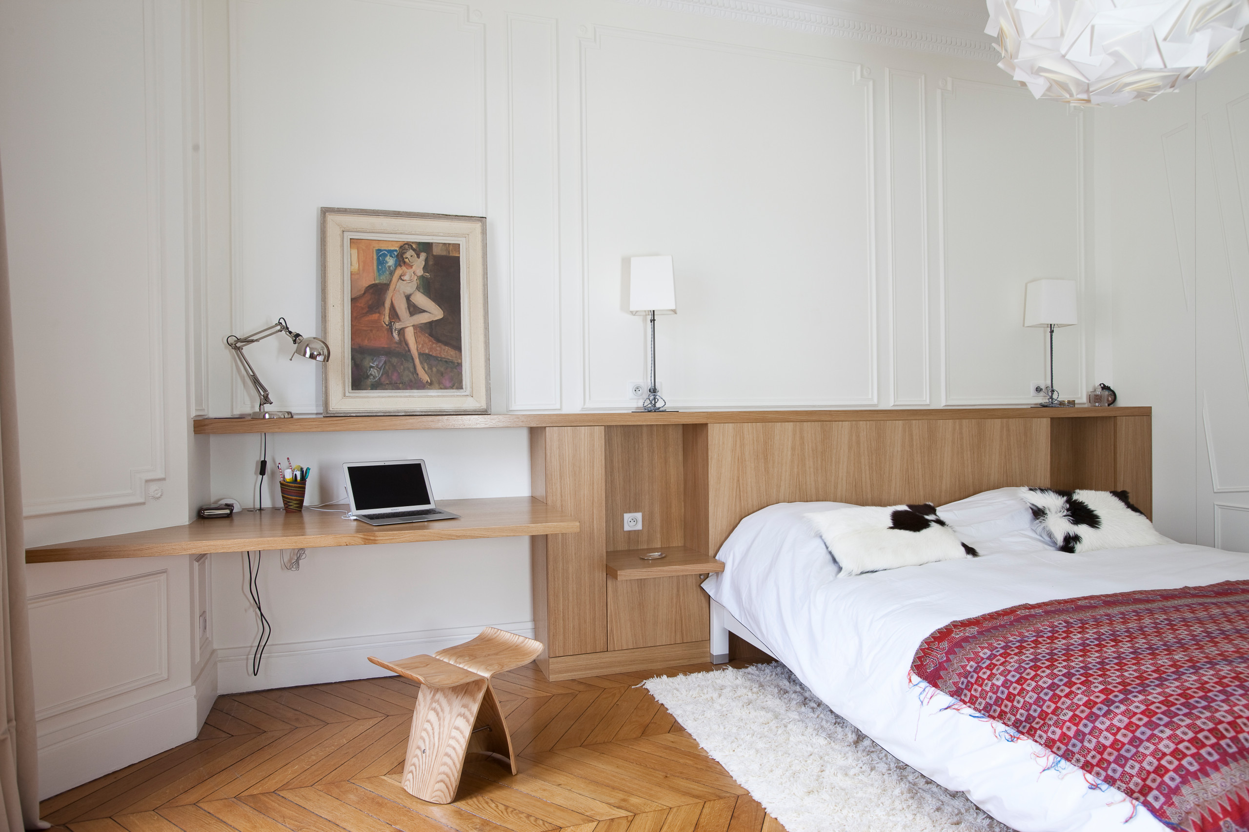 Dans cette autre chambre parisienne, pensée par l’Agence Olivia Clor, il a été suspendu à droite de la tête de lit. Une fois rabattu, la fonction travail est presque imperceptible et l’objet design prend le dessus avec ses lignes trapézoïdales. Les économes pourront aussi se tourner vers cette solution car les modèles premiers prix n’excèdent pas une cinquantaine d’euros.