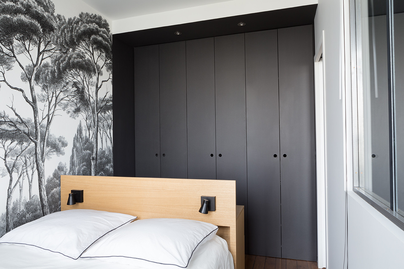 Voir son bureau (et donc son travail) depuis son lit n’est pas l’idéal pour trouver le soir la détente propice à l’endormissement. La solution retenue par les architectes de l’agence Lagom dans ce deux pièces parisien, d’installer son bureau en tête de lit en plaçant le lit en îlot, retient donc toute notre attention.