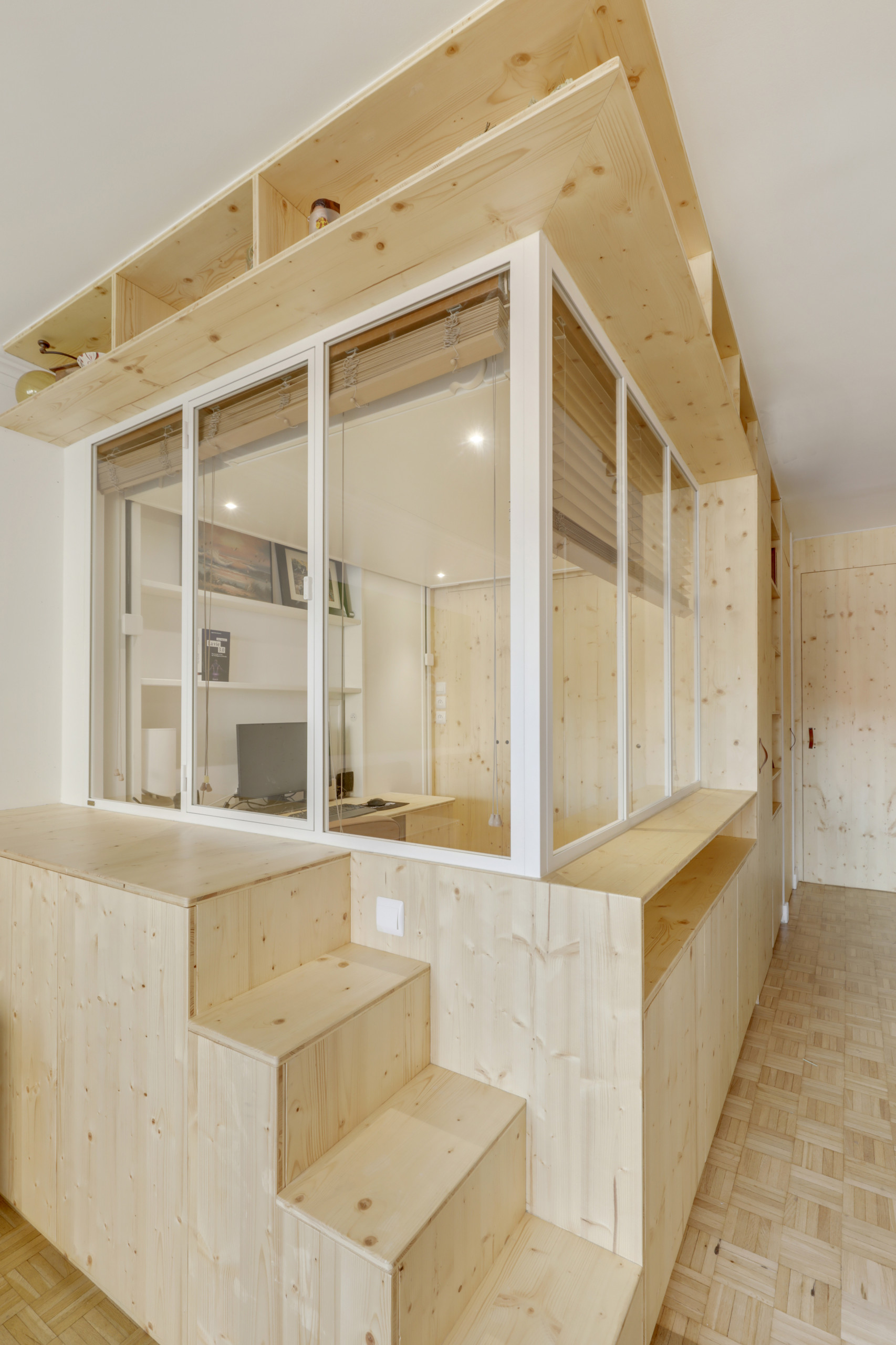 Ici, il a été équipé d’un fond qui remonte façon dosseret pour séparer le bureau du lit. Mais on peut également imaginer un lit avec sa tête de lit classique derrière laquelle on appuie son bureau.