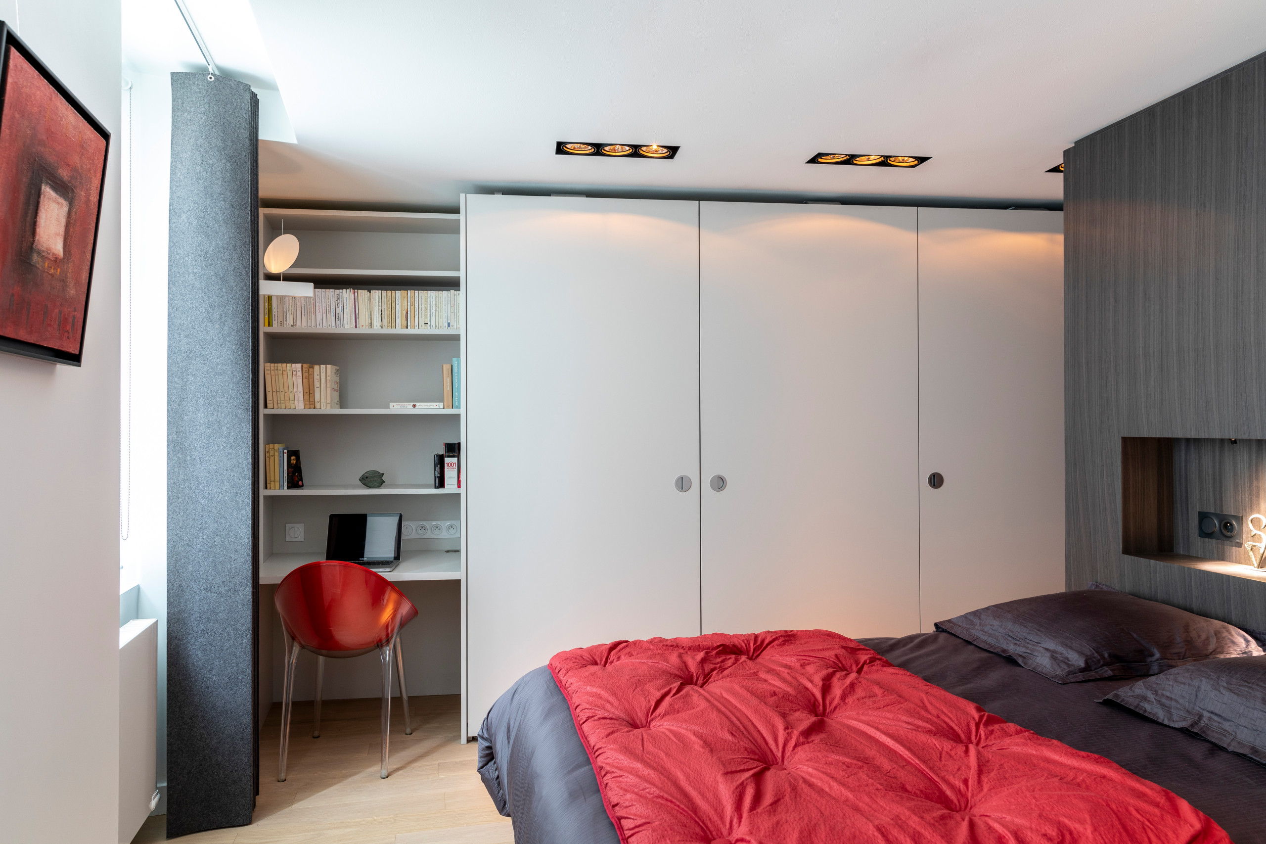 Le haut de la bibliothèque accueille des livres ou de la déco. Les dossiers sont cantonnés en bas du meuble, cachés par deux portes adaptées sur mesure à la bibliothèque. La chambre reste ainsi épurée.