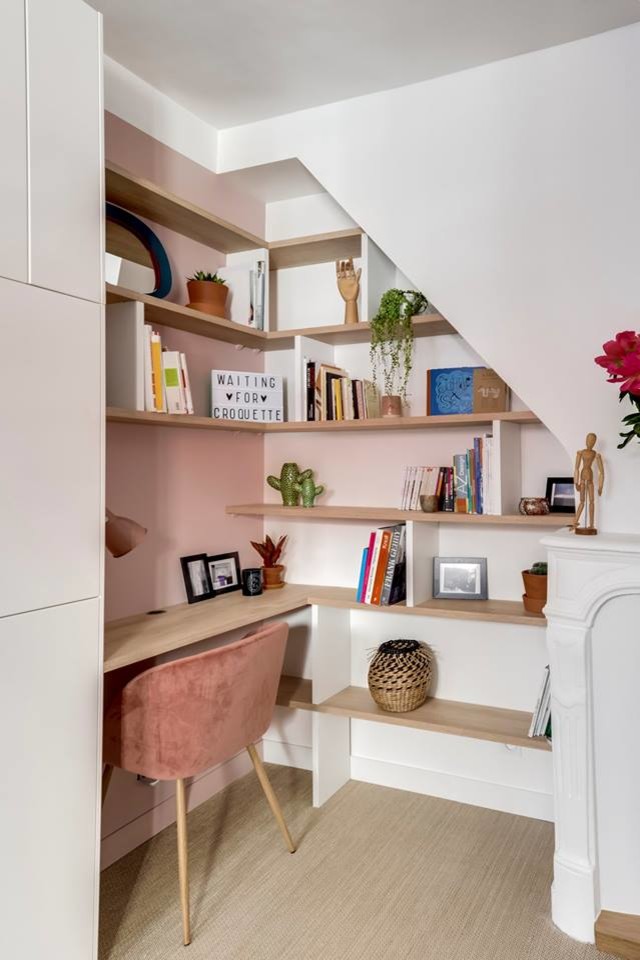 Si votre chambre comporte un angle vacant, cela peut être également le début de votre réflexion. À l’aide de planches vous pourriez vous aussi le transformer en bureau et bibliothèque, comme en ont eu l’idée les deux architectes d’intérieur Carla Lopez et Margaux Meza, de l’agence Transition Interior Design.