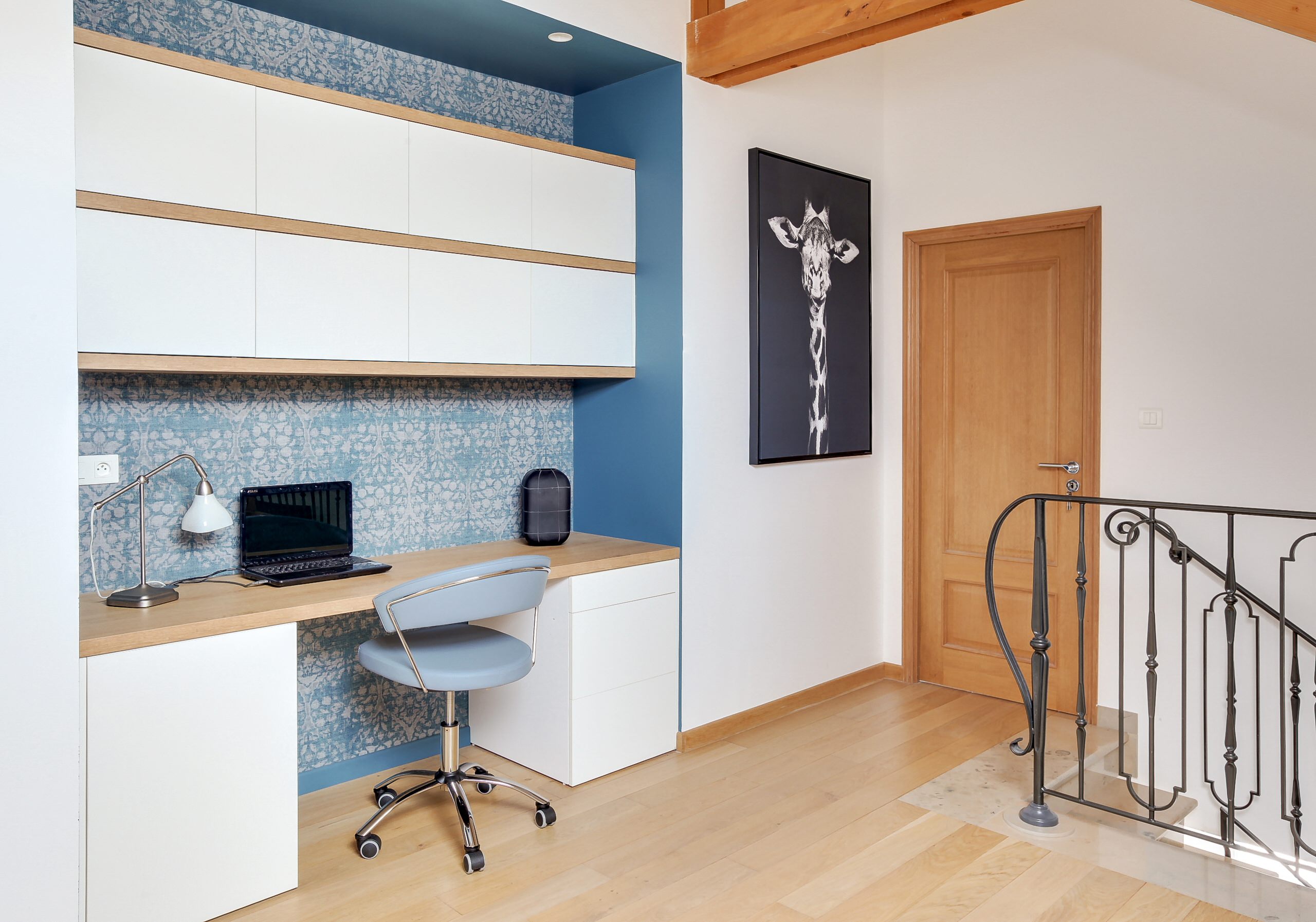 Enfin, si vous avez envisagé toutes les solutions dans la chambre et qu’un bureau ne fonctionne pas, il vous reste peut-être celle d’investir le palier comme dans cette maison à Dijon, de l’agence d’architecture intérieure SLAI. Cette idée peut paraître saugrenue au départ mais elle a permis d’intégrer ici un grand bureau et par conséquent, la chambre a conservé sa seule fonction de détente.