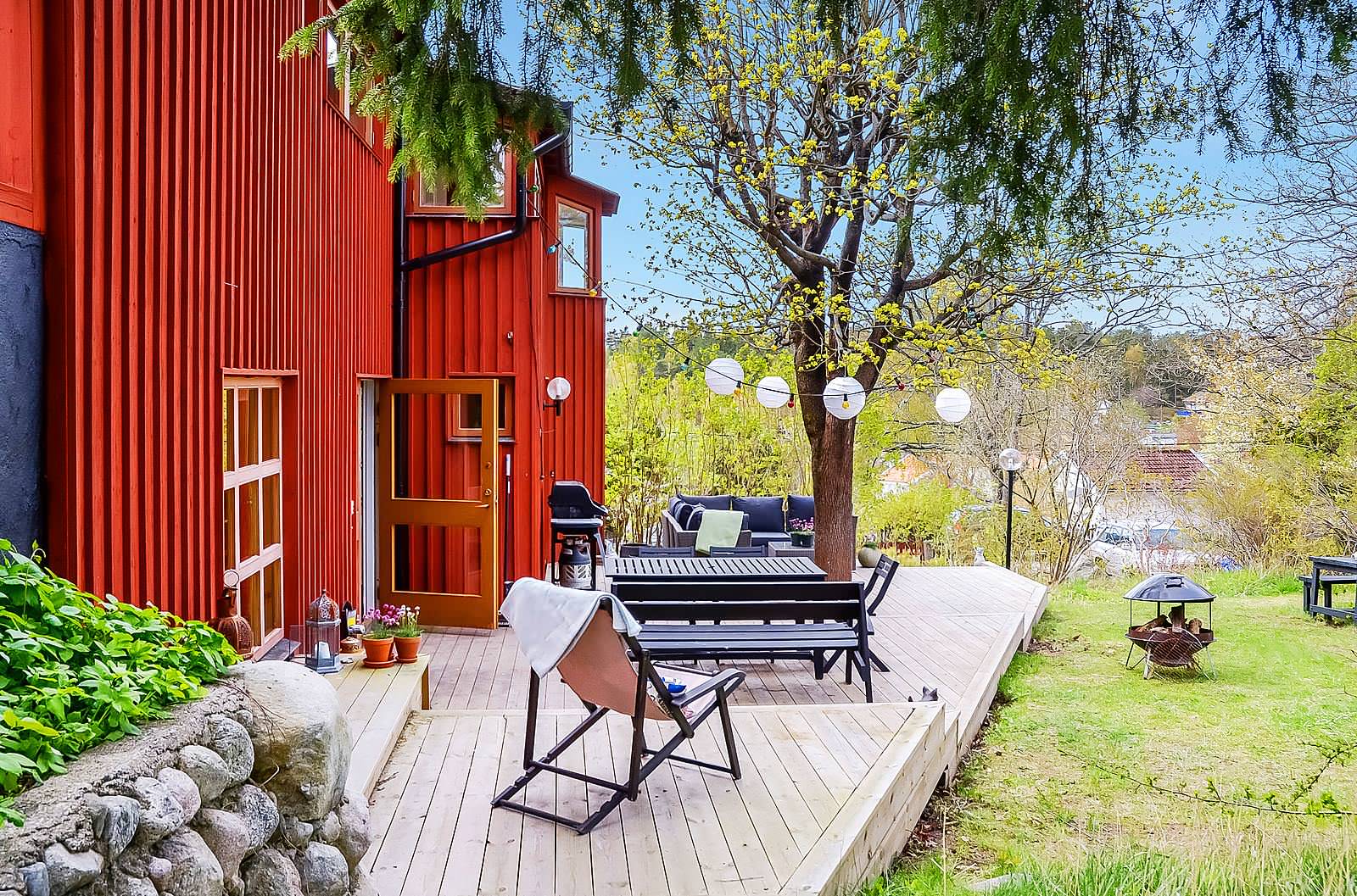 Qu’il s’agisse d’un ancien entrepôt métallique revisité en loft ou, comme ici, d’une grande bâtisse suédoise dont le bois a été peint en rouge, la terrasse s’inscrit également dans son style ! Optez pour du mobilier en accord avec son ambiance : une grande table de métier ou à lattes accompagnée de son banc noir. Ajoutez une ou deux fantaisies comme des guirlandes, lampions et quelques pots de fleurs et… c’est l’heure de la pause !