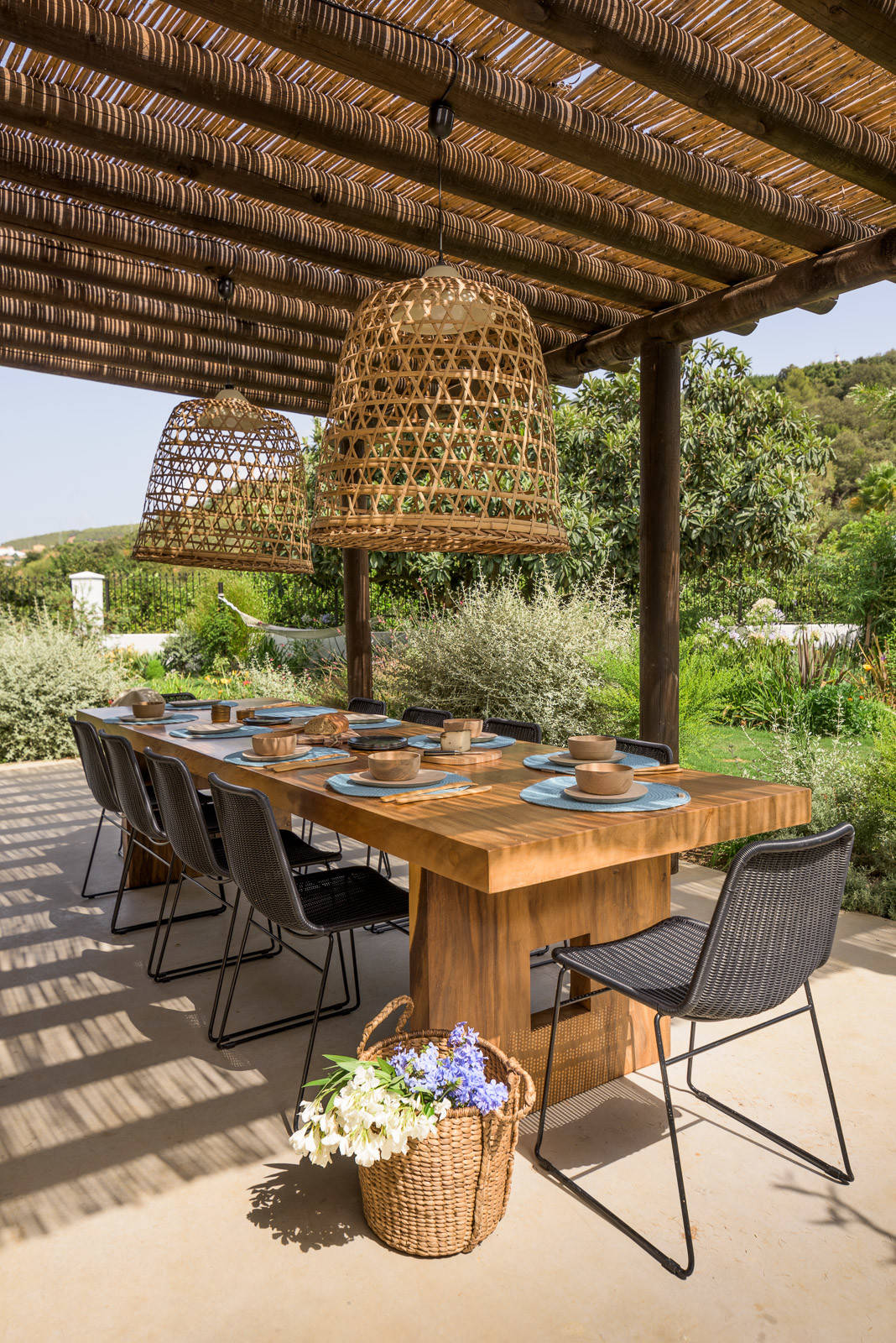 Décidément, les matières naturelles occupent bel et bien nos terrasses cet été ! Il y a bien sûr l’osier, le rotin ou leurs imitations en résine tressée, mais le bois signe aussi son grand retour, à l’intérieur comme à l’extérieur. Exit la table en plastique, en fer rouillé, on veut du bois massif et si possible d’une belle épaisseur de coupe ! Les pergolas aussi se réinventent comme cette vaste indienne en claustra pour filtrer le soleil. Quant au banc, on l’aime suspendu, façon balancelle.